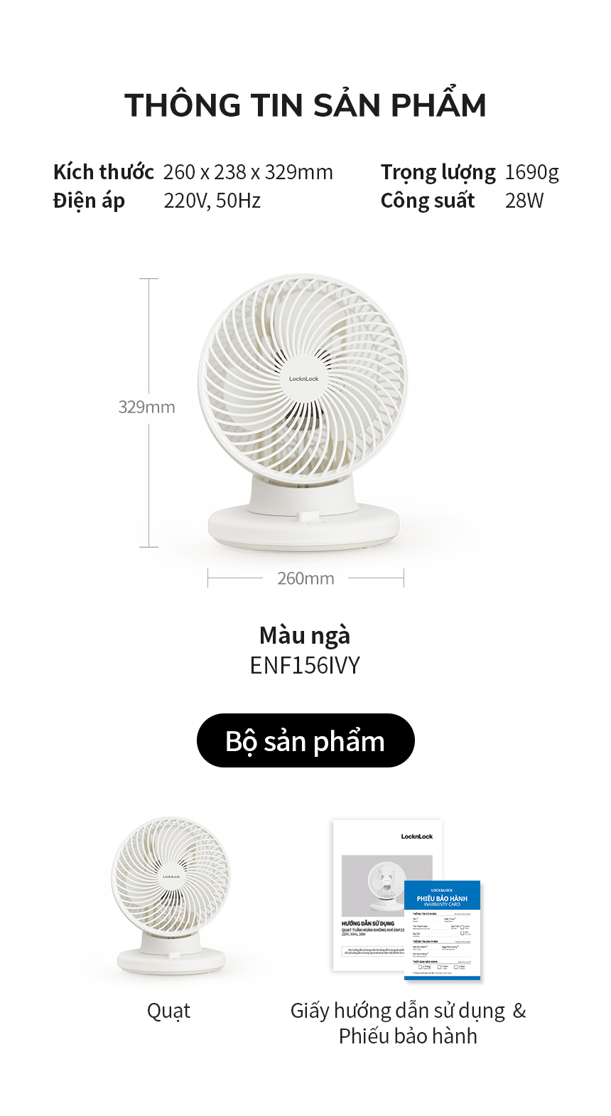 Quạt tuần hoàn không khí LocknLock Bianco ENF156IVY, Hàng chính hãng, để bàn, luồng gió đa chiều - JoyMall THÔNG TIN SẢN PHẨM Thông số: 220V, 50Hz, 28W Chất liệu: Nhựa PP, nhựa ABS Xuất xứ: Trung Quốc Kích thước (mm): 260x238x329 Cân nặng: 1.69 kg TÍNH NĂNG NỔI BẬT LUỒNG GIÓ ĐA CHIỀU: Với chế độ xoay, quạt tự động điều hướng quay sang trái 40° và phải 40°. Có thể điều chỉnh hướng quay lên và xuống bằng tay từ 0° đến 90° (7 vị trí). 3 TỐC ĐỘ GIÓ TÙY CHỌN: Luôn mang đến làn gió dễ chịu với 3 tốc độ gió (thấp, trung bình, cao), với chế độ xoay hoặc không xoay. VẬN HÀNH ÊM ÁI: Động cơ hoạt động tạo ra tiếng ồn thấp, không làm phiền đến sinh hoạt của bạn. (độ ồn của quạt từ 28dB tới 47dB). TAY CẦM TIỆN LỢI: Dễ dàng di chuyển với tay cầm thuận tiện và thiết kế nhỏ gọn. CHÂN ĐẾ CHỐNG TRƯỢT: Chống trượt và giúp giữ quạt ổn định, đúng vị trí khi vận hành. VỆ SINH DỄ DÀNG: Lồng quạt trước và cánh quạt có thể tháo rời và vệ sinh với nước, giúp quạt hoạt động hiệu quả mà không bị bám bụi. KẾT HỢP ĐỂ TIẾT KIỆM HƠN:  Sự lựa chọn hoàn hảo cùng với máy điều hòa, giúp luân chuyển luồng khí mát mẻ một cách hiệu quả và mang lại hiệu quả làm mát tối đa. Lưu ý: