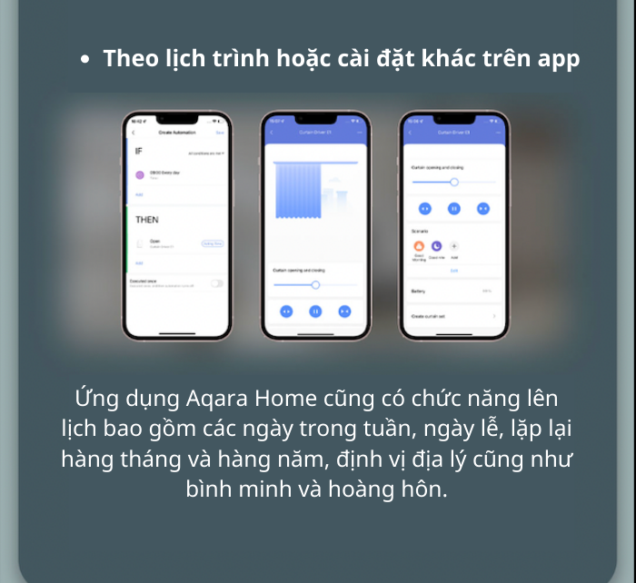 Mở rèm vào lúc 8h sáng và đóng rèm lúc 8h tối Mở rèm khi bạn trở về nhà Khi trời tối thì rèm tự động đóng lại và bật đèn lên cùng lúc Ưu