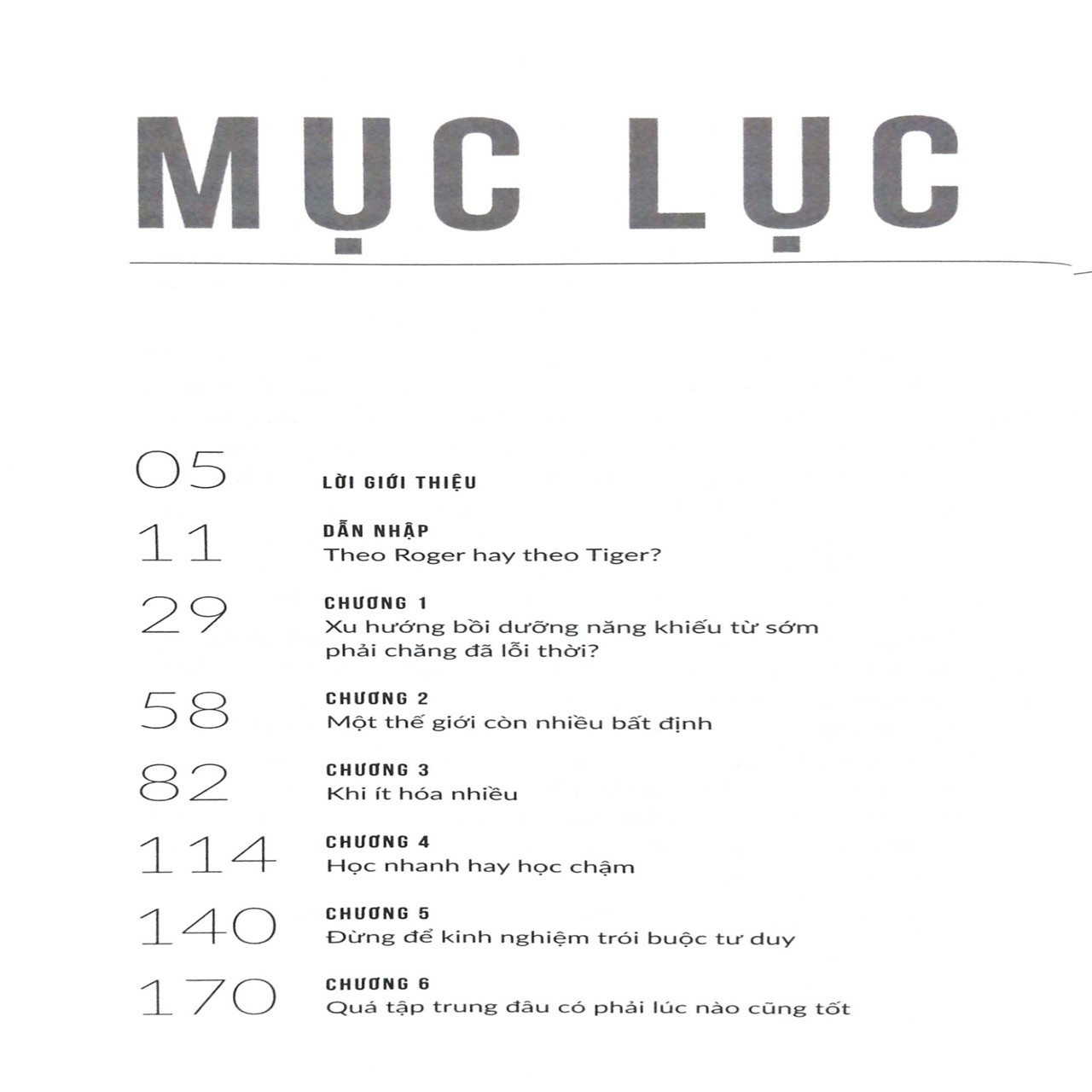 Rất nhiều chuyên gia lập luận rằng bất kỳ ai muốn phát triển một kỹ năng, chơi một nhạc cụ hoặc dẫn đầu lĩnh vực của mình đều nên bắt đầu sớm, tập trung cao độ và dành nhiều thời gian luyện tập có chủ ý nhất có thể. Nếu bạn vọc vạch hoặc trì hoãn, bạn sẽ không bao giờ bắt kịp những người dẫn đầu. Nhưng xem xét kỹ hơn nghiên cứu về những người có thành tích hàng đầu thế giới, từ vận động viên chuyên nghiệp đến người đoạt giải Nobel, tất cả cho thấy rằng chuyên môn hóa sớm là ngoại lệ, không phải là quy luật.