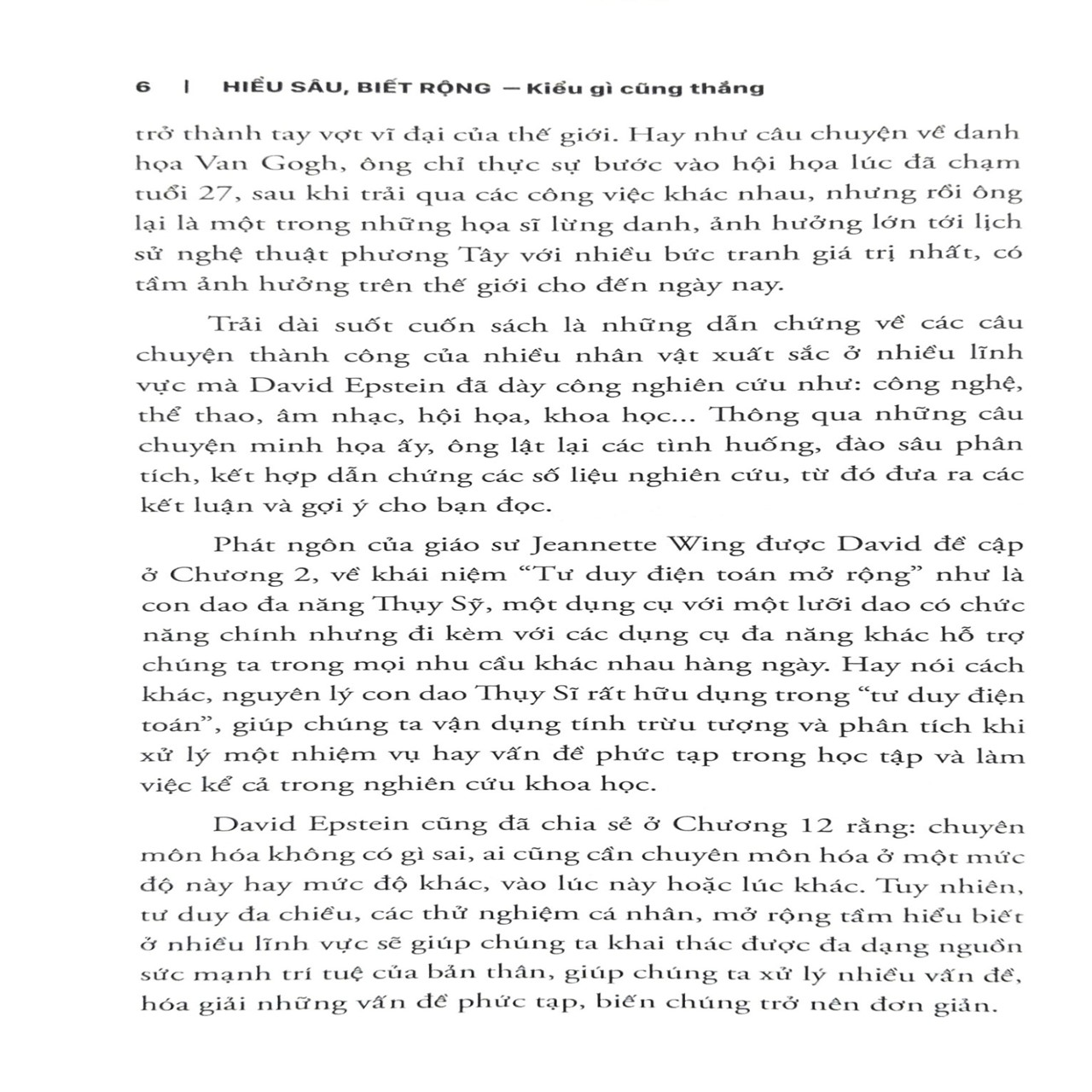 David Epstein đã kiểm tra các vận động viên, nghệ sĩ, nhạc sĩ, nhà phát minh, nhà dự báo và nhà khoa học thành công nhất thế giới. Ông phát hiện ra rằng trong hầu hết các lĩnh vực – đặc biệt là những lĩnh vực phức tạp và khó đoán – những người có tư duy tổng quát (chứ không phải chuyên gia) đều có tố chất xuất sắc. Những người theo chủ nghĩa tổng quát thường tìm ra con đường của mình muộn và họ có nhiều mối quan tâm hơn là tập trung vào một. Họ cũng sáng tạo hơn, nhanh nhẹn hơn và có thể tạo ra những kết nối mà những đồng nghiệp chuyên môn hóa không thể nhìn thấy.