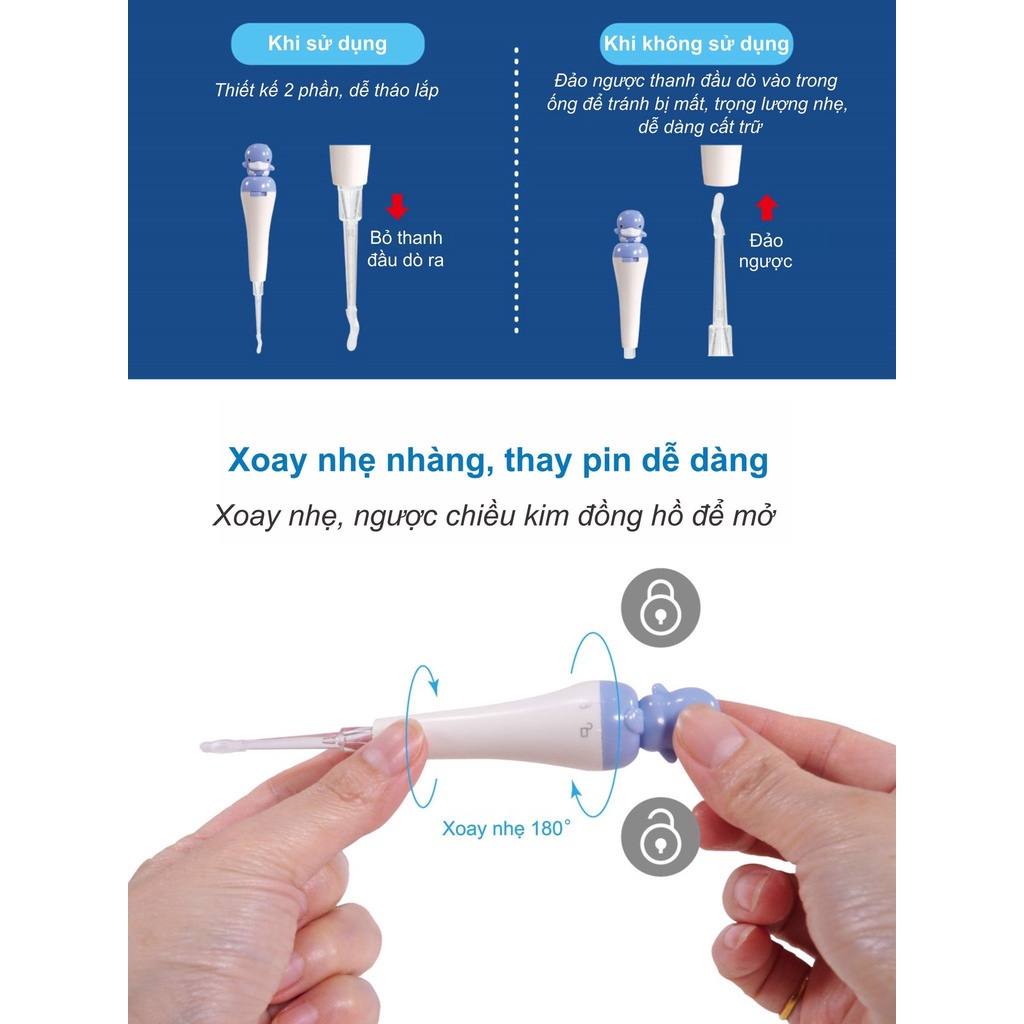 Trang bị đèn led với ánh sáng dịu nhẹ, giúp mẹ nhìn rõ bụi bẩn trong tai, bảo vệ ống tai khỏi tổn thương khi không nhìn rõ. - Thiết kế nhỏ gọn, tiện dụng,