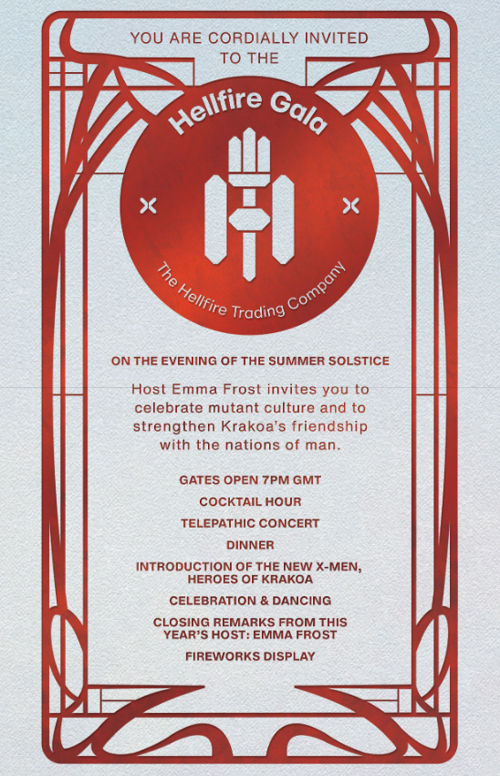 Party time in the Reign of X! The Hellfire Gala is the biggest mutant event of the season, and Emma Frost is your host for a night of dinner, drinks and deceit. Everyone will be there, dressed to the nines — your favorite mutants, their closest allies…even their worst enemies! X-Force will be on hand to deal with any troublemakers and gatecrashers — but can the Hellions somehow get an invitation, or will they be turned away at the door? Meanwhile, for Captain Britain and Excalibur, the Gala may result in a diplomatic incident! Either way, raise your glasses for the first big moment of the night — the eagerly awaited announcement of Krakoa’s very first elected team of X-Men!