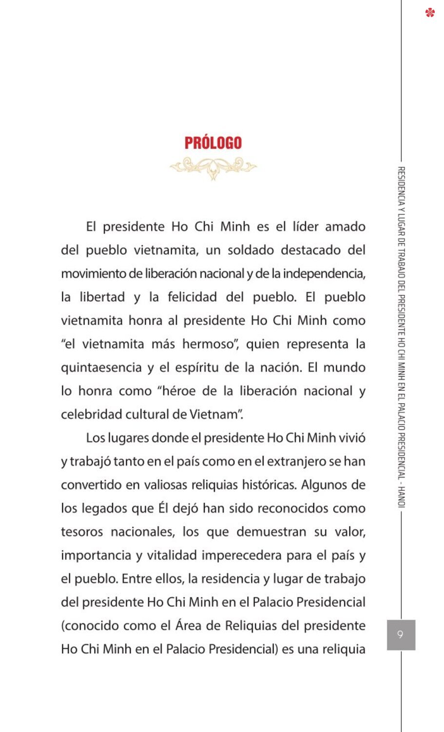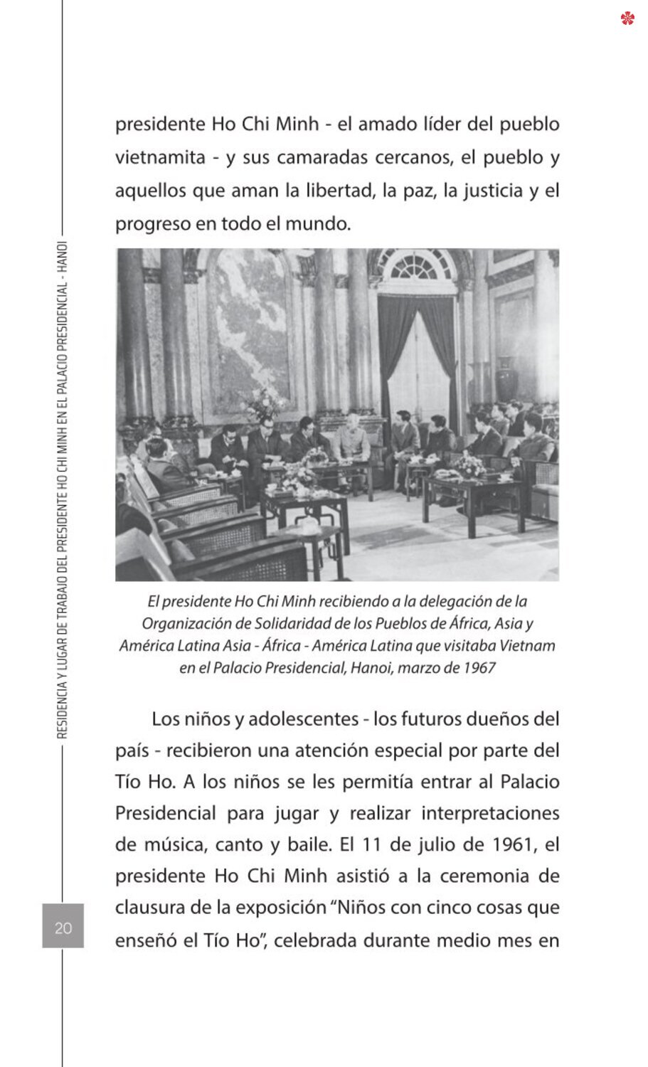 El libro Residencia y lugar de trabajo del presidente Ho Chi Minh en el Palacio Presidencial - Hanoi ofrece a los lectores un recurso valioso que nos ayuda a comprender mejor la vida del amado líder del de la nación vietnamita. El libro recrea de forma realista y lleva al lector a cada pequeño rincón, a cada recuerdo, a cada historia sencilla pero impregnada de significado histórico y humano sobre los lugares asociados al presidente Ho Chi Minh en el Palacio Presidencial como: la Casa 54, la Casa sobre pilotes, la Casa 67, el estanque de peces, el camino de mangos, lentre otros.