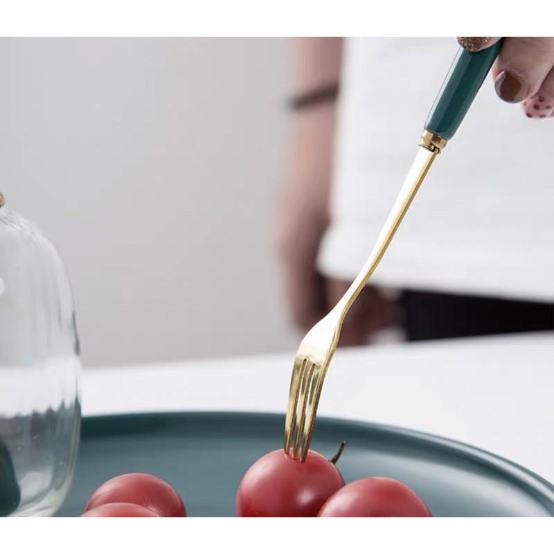 Thìa dĩa mạ vàng cán sứ màu xanh nĩa ăn trái cây / muỗng cà phê dài 15cm