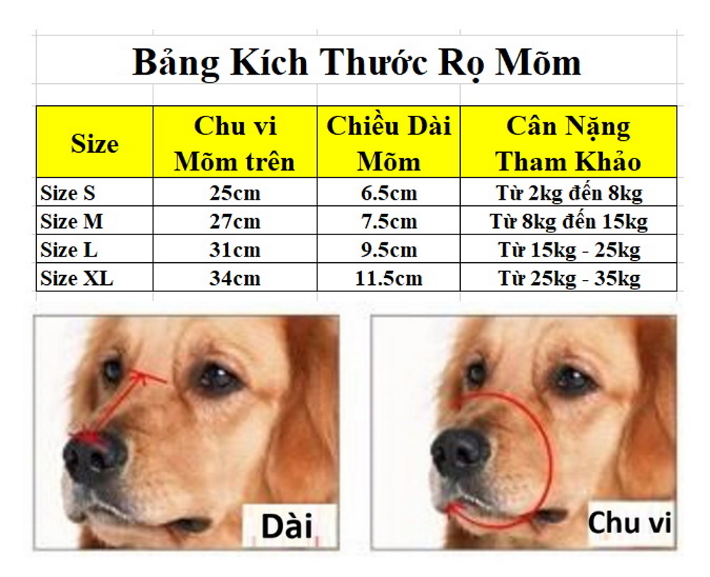 - Size XL: Cân nặng từ 25kg - 35kg ~ (Vòng mõm trên rọ 34cm, Vòng mõm dưới rọ 24cm)