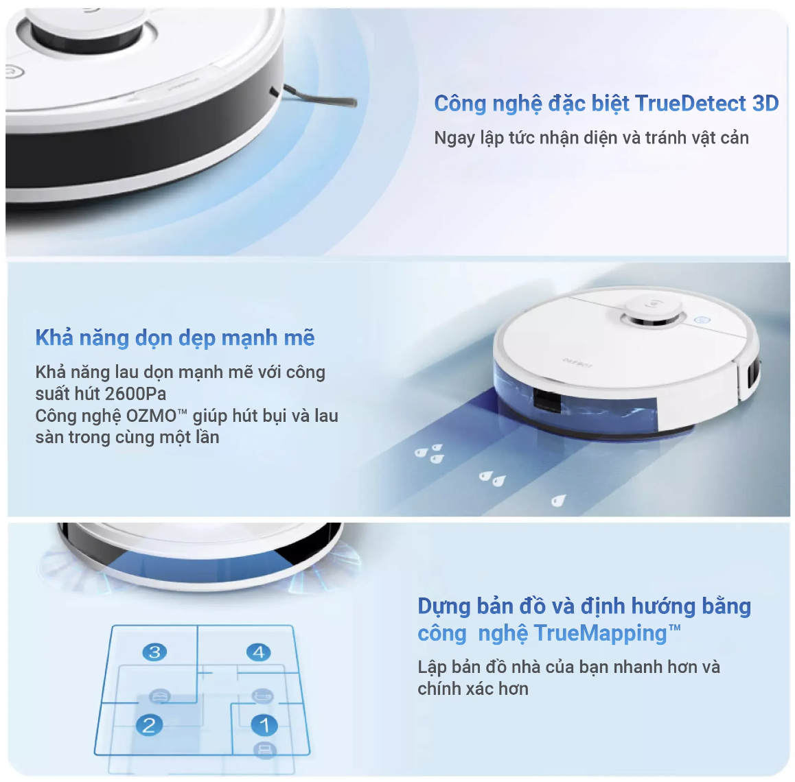 Tích hợp công nghệ Quét laser 3D định vị hệ thống hiển thị bản đồ toàn bộ ngôi nhà. Chốt quét: 2 chiếc Tự động quay về dock sạc, leo dốc 3cm. Thời gian sạc