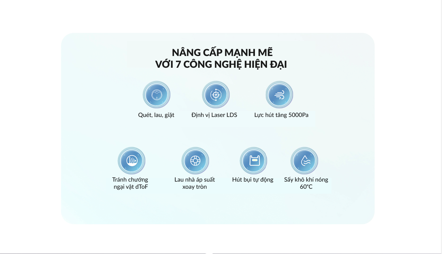 Tích hợp công nghệ Quét laser 3D định vị hệ thống hiển thị bản đồ toàn bộ ngôi nhà. Chốt quét: 2 chiếc Tự động quay về dock sạc, leo dốc 3cm. Thời gian sạc