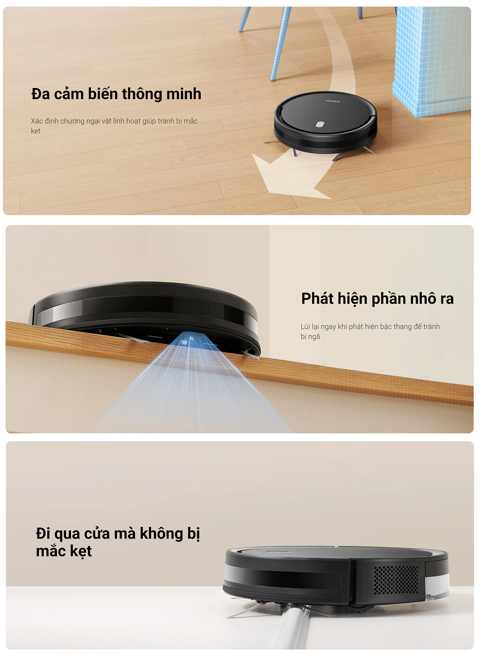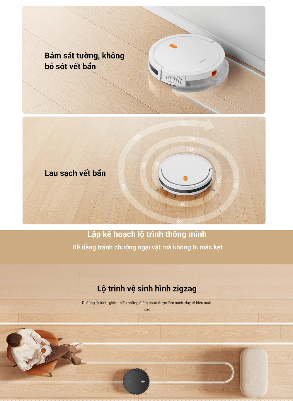- Lộ trình vệ sinh hình zigzag thông minh, có thể tránh chướng ngại vật linh hoạt