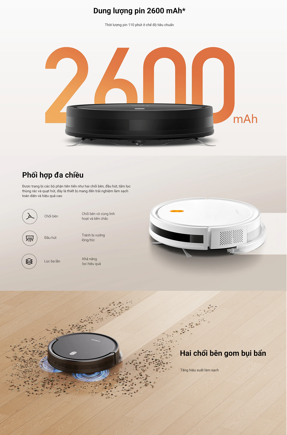Đặc điểm nổi bật Robot 2 trong 1 vừa có chức năng hút bụi vừa lau sàn nhà Chân quét xung quanh máy giúp dễ dàng quét sạch bụi bẩn Thời lượng Pin dài, máy