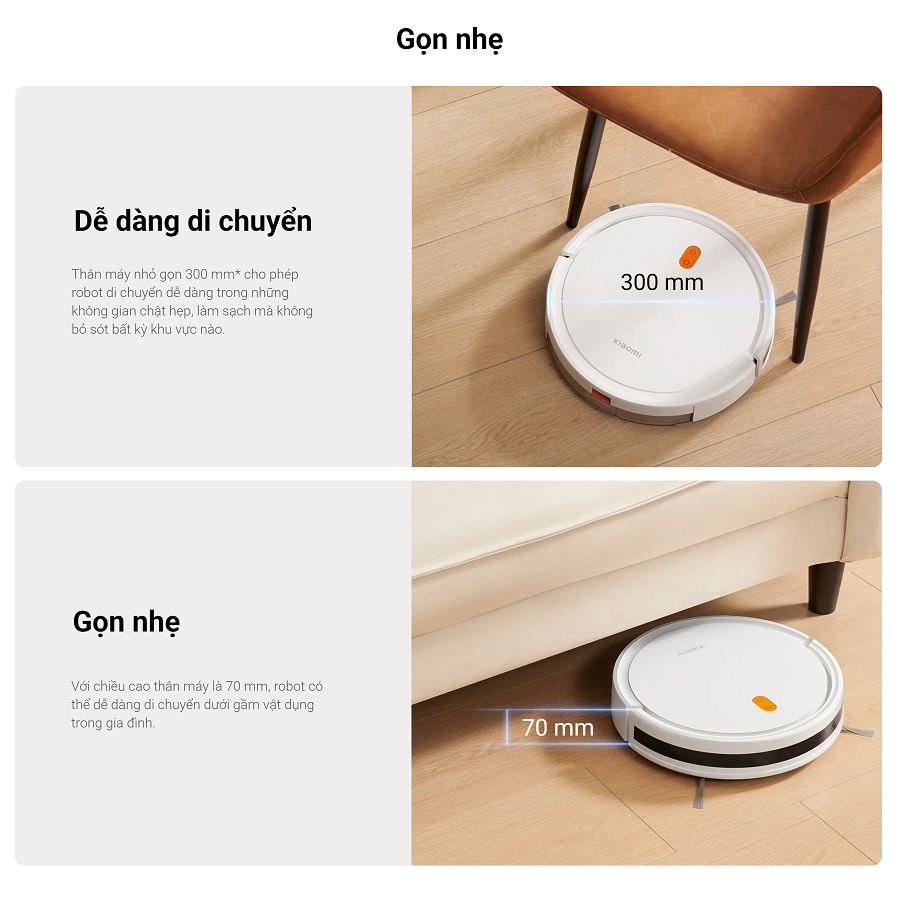 - Bảo hành 12 tháng chính hãng toàn quốc Tên sản phẩm: Robot hút bụi Xiaomi Robot Vacuum E5 Kích thước: Φ300x70 mm Công suất định mức :25 W Điện áp định mức :14,4 V ⎓ Điện áp sạc: 20 V ⎓ Dung lượng pin: 2500 mAh (dung lượng định mức), 2600 mAh (dung lượng danh định) Khối lượng tịnh: 2,3 kg Phát hiện chướng ngại vật: Tấm cảm biến Loại chổi chính: Cố định Lau nhà :Tấm cố định Đế sạc Model: CDZC108 Kích thước: 170×134×82,5 mm Đầu vào định mức: 20 V ⎓ 0,6 A Đầu ra định mức: 20 V ⎓ 0,6 A Bộ sản phẩm gồm: Thân máy x1 Ngăn chứa bụi x1 (Được lắp sẵn trên thân máy) Bình chứa nước x1 Chổi bên x2 Miếng lau nhà x1 (Được lắp sẵn trên bình chứa nước) Bộ đổi nguồn x1 Đế sạc x1 Chổi vệ sinh x1 (Được lắp sẵn trên khuôn giấy) Hướng dẫn sử dụng x1 Bảo hành 12 tháng chính hãng toàn quốc