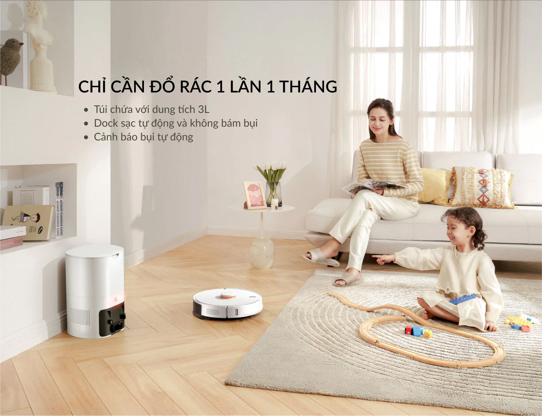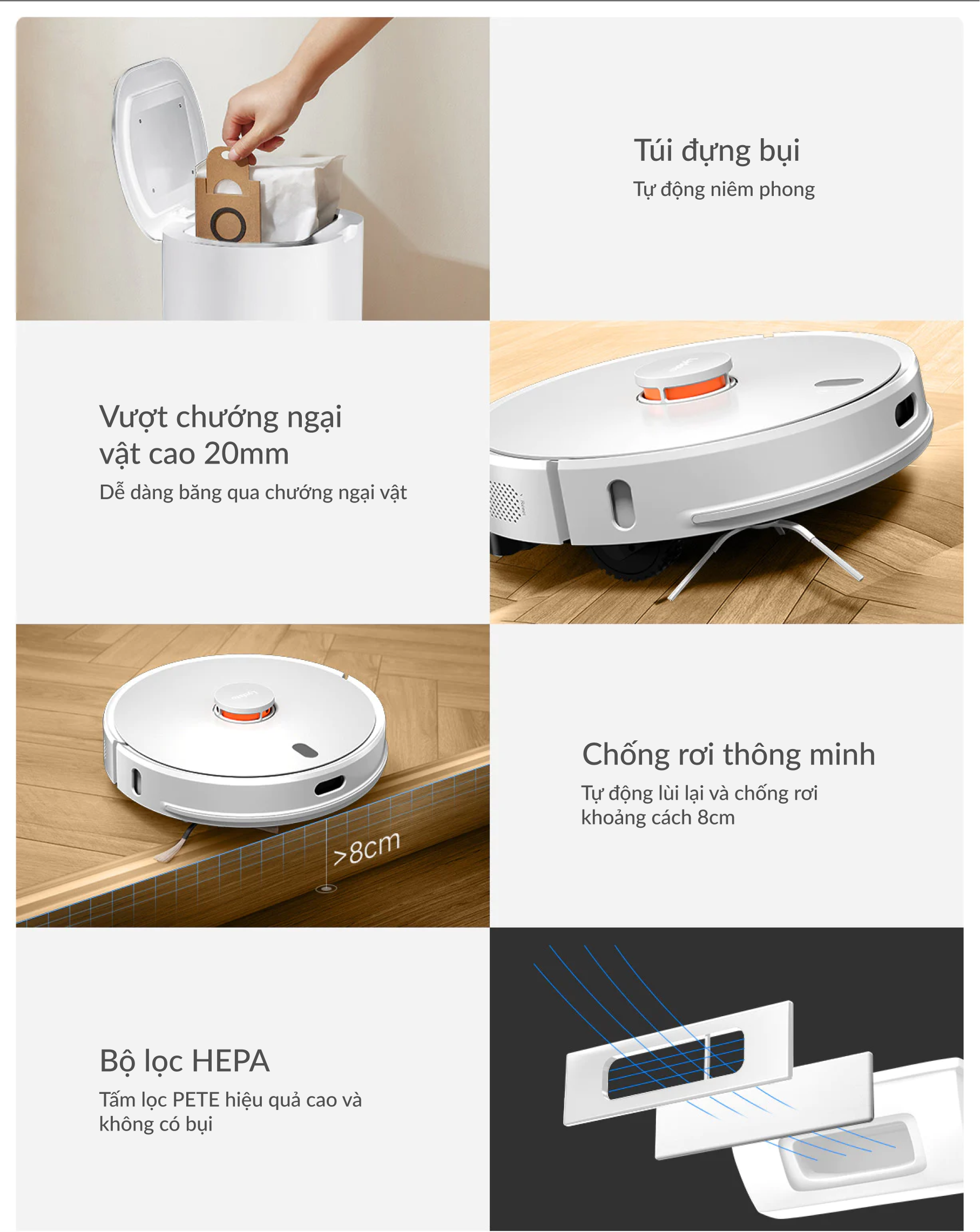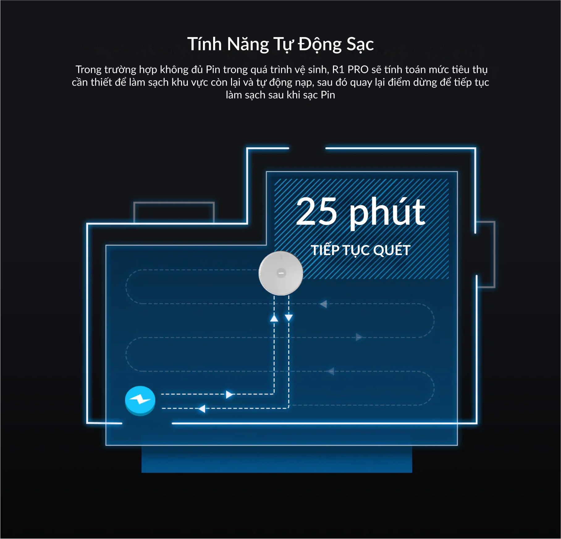 Tích hợp công nghệ Quét laser 3D định vị hệ thống hiển thị bản đồ toàn bộ ngôi nhà. Chốt quét: 2 chiếc Tự động quay về dock sạc, leo dốc 3cm. Thời gian sạc