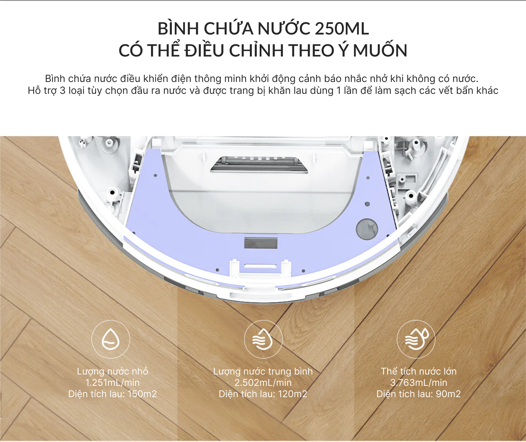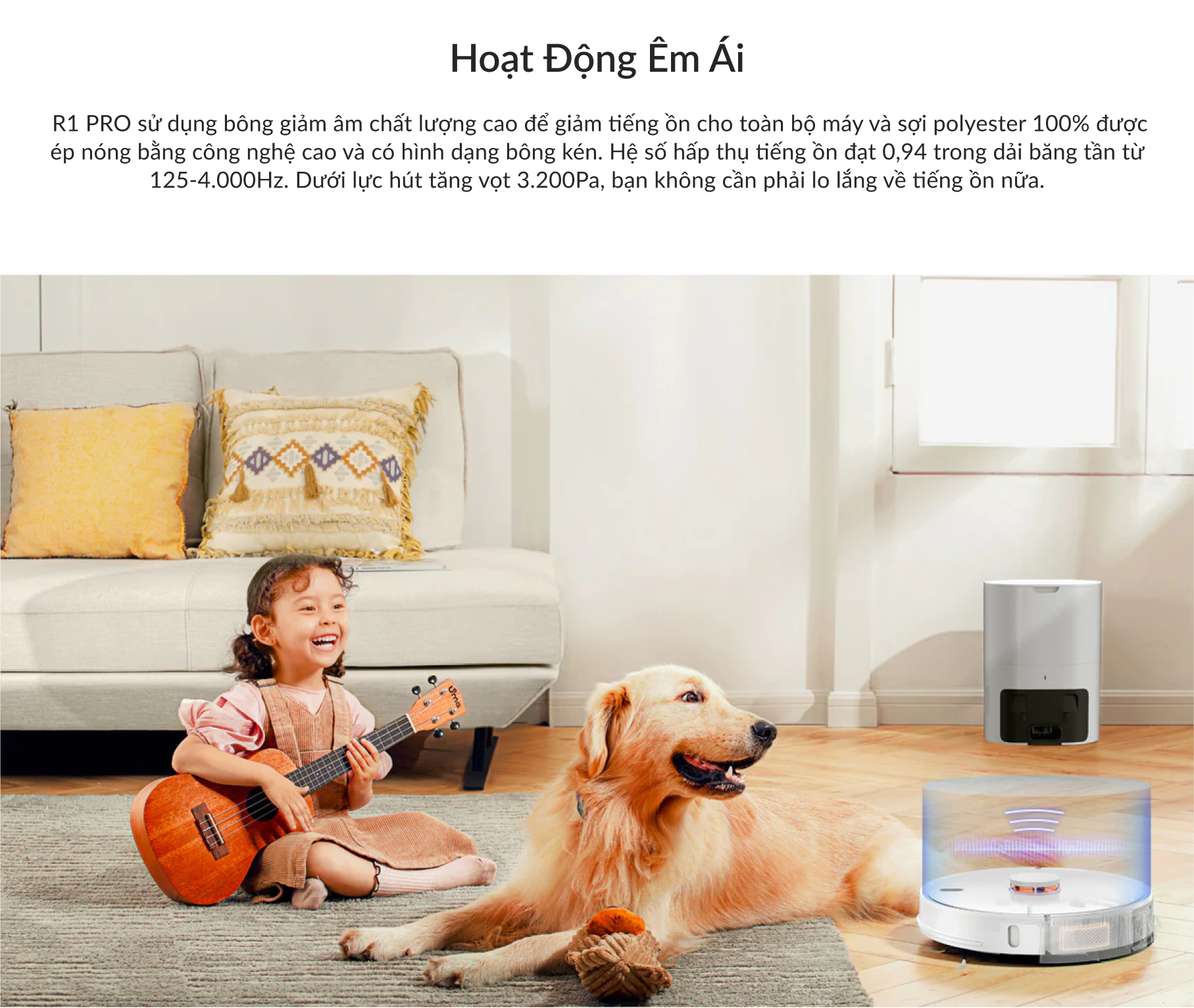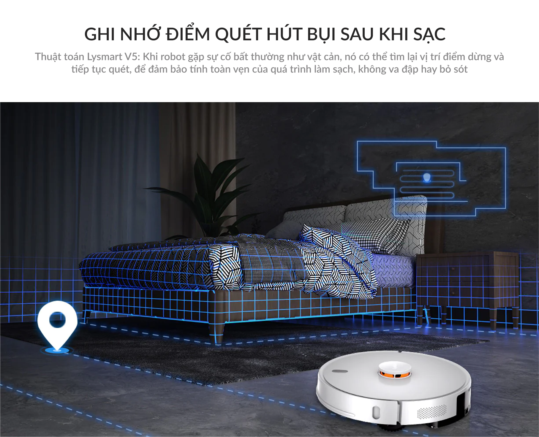 Tích hợp công nghệ Quét laser 3D định vị hệ thống hiển thị bản đồ toàn bộ ngôi nhà. Chốt quét: 2 chiếc Tự động quay về dock sạc, leo dốc 3cm. Thời gian sạc
