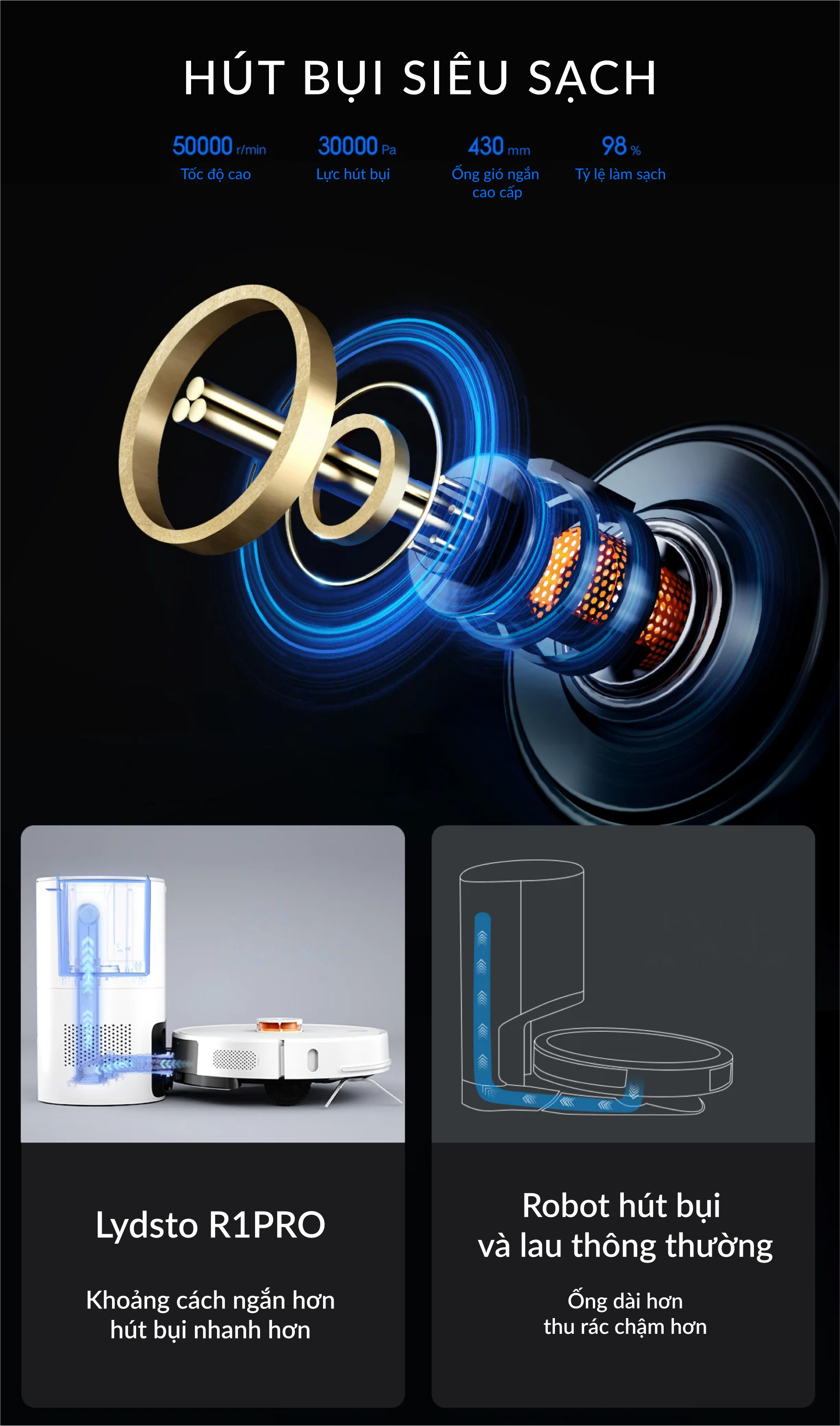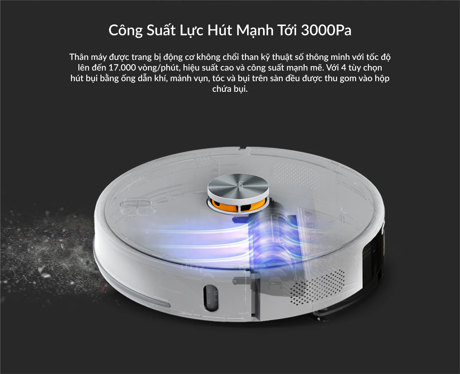 CÔNG SUẤT HÚT MẠNH MẼ chế độ lau chế độ hút 4000PA Hút sạch và cực sâu, loại bỏ hoàn toàn bụi và rác mang lại bầu không khí trong lành lý tưởng.