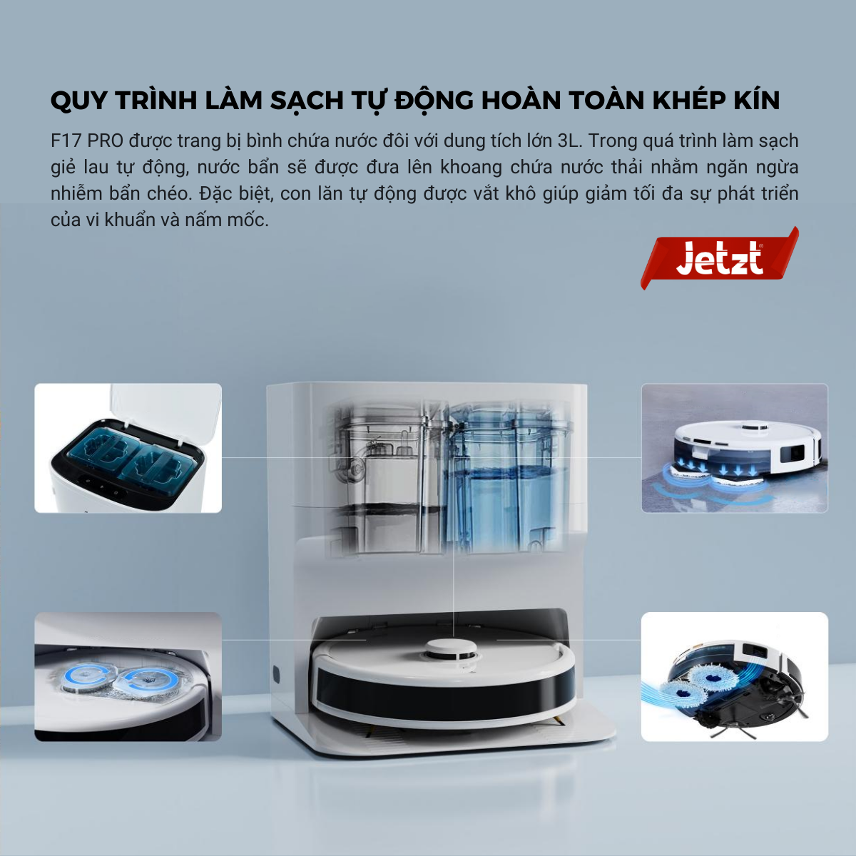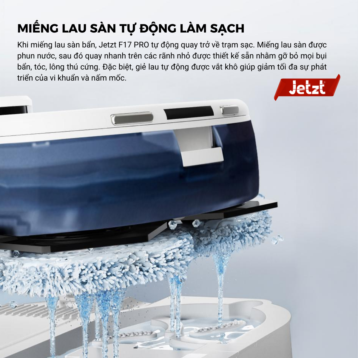 Khi miếng lau sàn bẩn, Jetzt F17 PRO tự động quay trở về trạm sạc. Miếng giẻ lau được phun nước, sau đó quay nhanh trên các rãnh nhỏ được thiết kế sẵn nhằm gỡ bỏ mọi bụi bẩn, tóc, lông thú cứng. Ngoài ra, F17 PRO được trang bị thêm bình chứa nước đôi với dung tích lớn 3L. Trong quá trình làm sạch giẻ lau tự động, nước bẩn sẽ được đưa lên khoang chứa nước thải nhằm ngăn ngừa nhiễm bẩn chéo. Đặc biệt, giẻ lau tự động được vắt khô giúp giảm tối đa sự phát triển của vi khuẩn và nấm mốc.