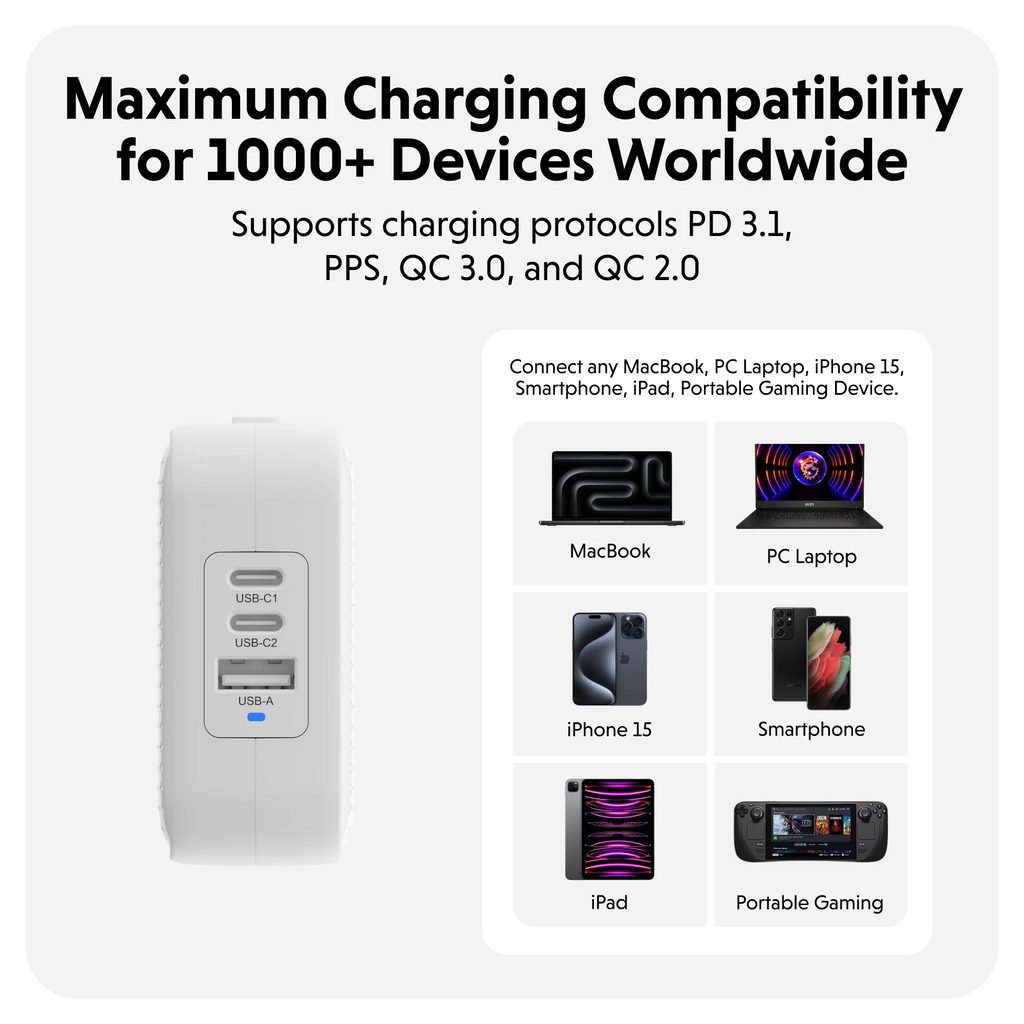 Tương Thích Đa Thiết Bị: Hỗ trợ nhiều giao thức sạc, đảm bảo tương thích với trên 1000 thiết bị khác nhau.