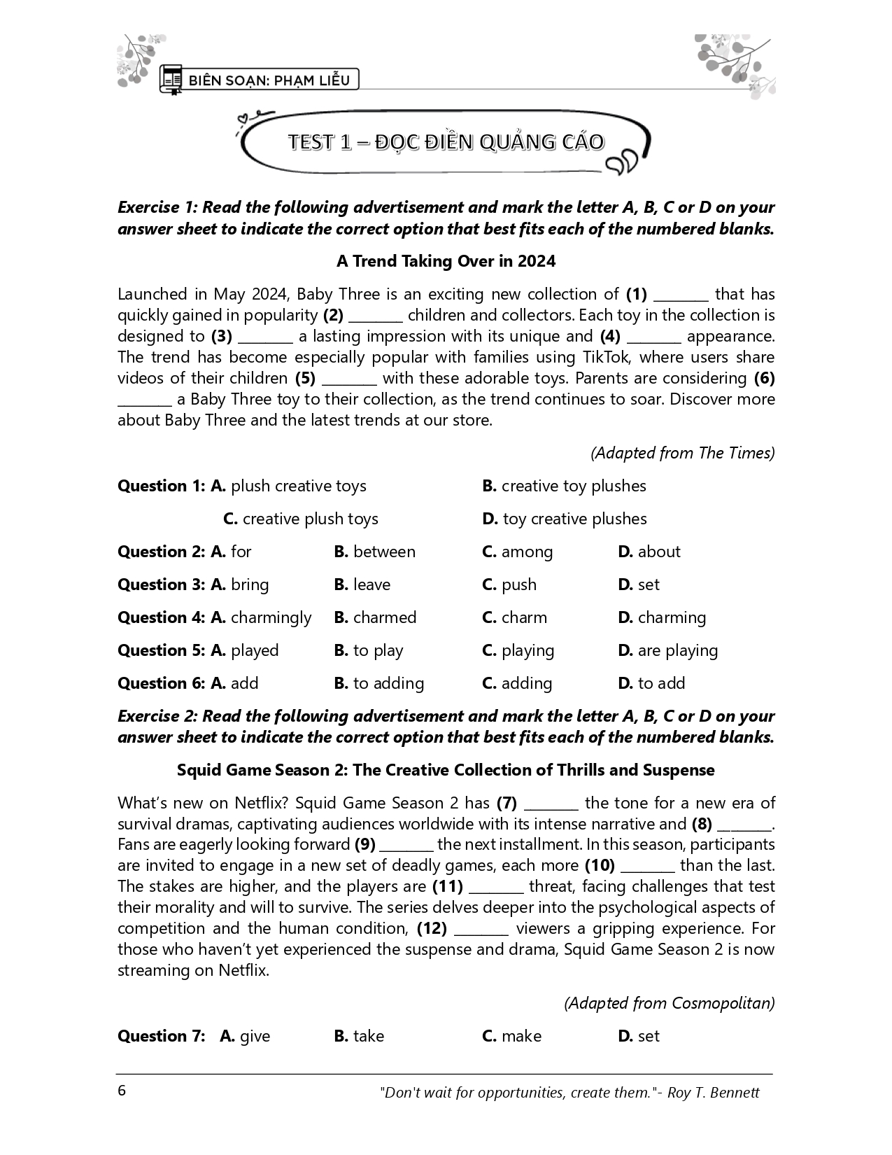 Mua tại TiktokCác kỳ thi Tốt nghiệp THPT Quốc gia và Đánh giá năng lực ngày càng chú trọng vào kỹ năng đọc hiểu, vì vậy việc rèn luyện phương pháp và thực hành thường xuyên là chìa khóa để đạt điểm cao. Cuốn sách "1000 Câu Trắc Nghiệm Luyện Kỹ Năng Đọc Điền – Đọc Hiểu Môn Tiếng Anh" được biên soạn nhằm giúp các em nâng cao kỹ năng này, với hệ thống bài tập đa dạng, bám sát cấu trúc đề thi thực tế. Bố cục sách gồm 4 chuyên đề trọng tâm Chuyên đề 1: Đọc điền quảng cáo Chuyên đề 2: Đọc điền tờ rơi Chuyên đề 3: Đọc điền khuyết thông tin Chuyên đề 4: Đọc hiểu
