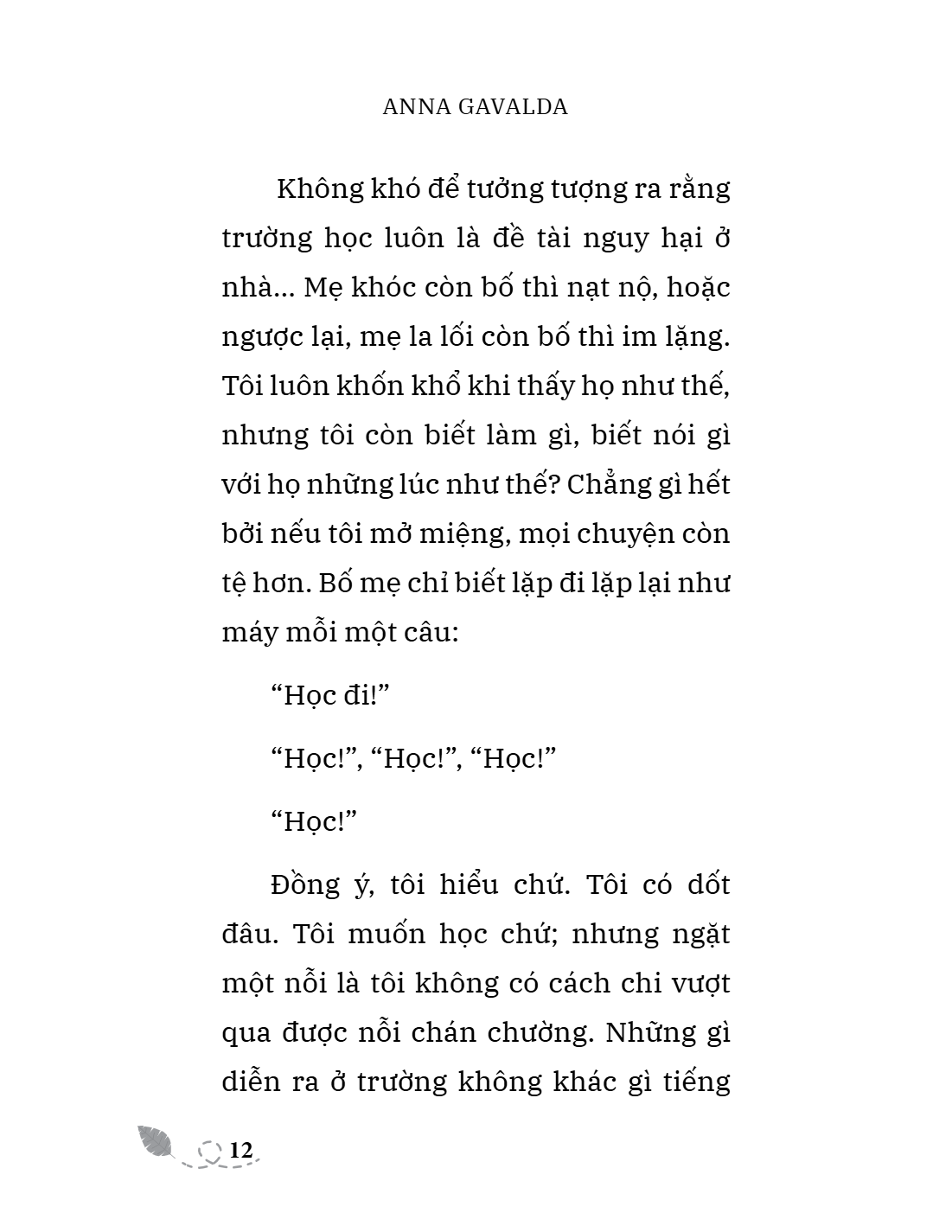 Tôi không ưa cô Daret. Tôi ghét âm sắc giọng nói của cô, kiểu cách của cô và cả cái lối trò cưng của cô. Nhưng tôi học cách đọc bởi vì tôi muốn làm được con hà mã từ hộp đựng trứng ở trang 124 trong cuốn sách cô Marie tặng.