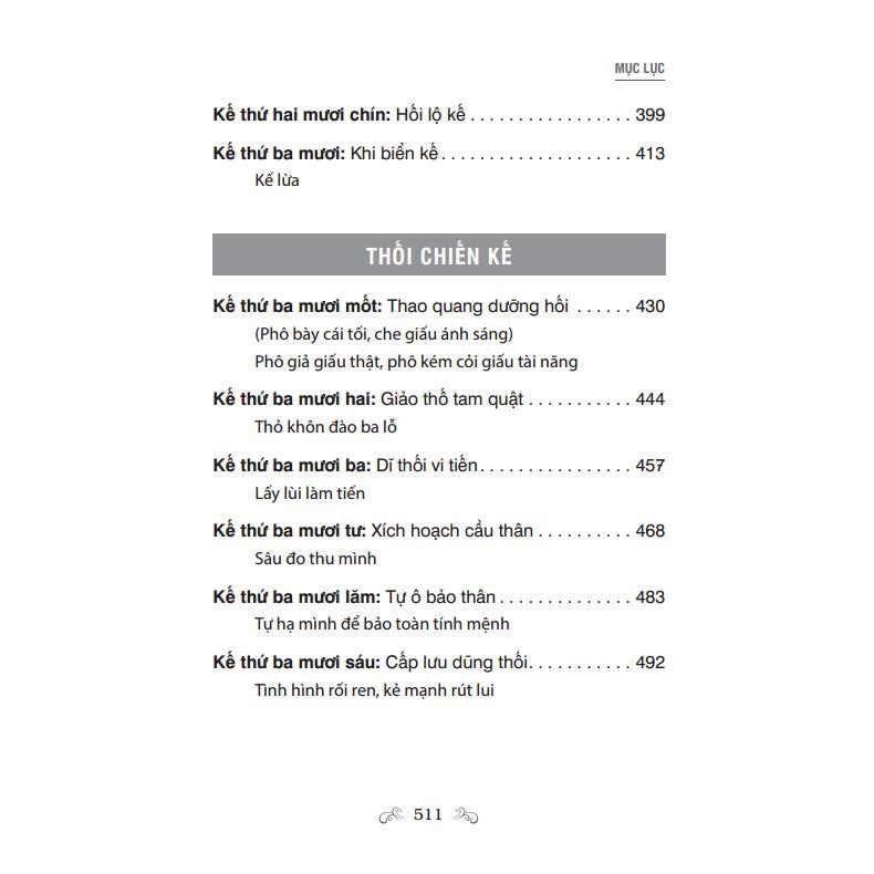 “36 Mưu Kế Và Xử Thế” có kết cấu chia làm bốn phần lớn là Chiến thắng kế, Cường chiến kế, Nhược chiến kế, Thối chiến kế. Trong mỗi phần lớn lại chia ra các kế nhỏ giúp người đọc dễ nắm bắt và tiếp thu. Không chỉ mang tíh thực tế cao cuốn sách cò chứa đựng giá trị nhân văn sâu sắc, thiết thực trong đời sống.