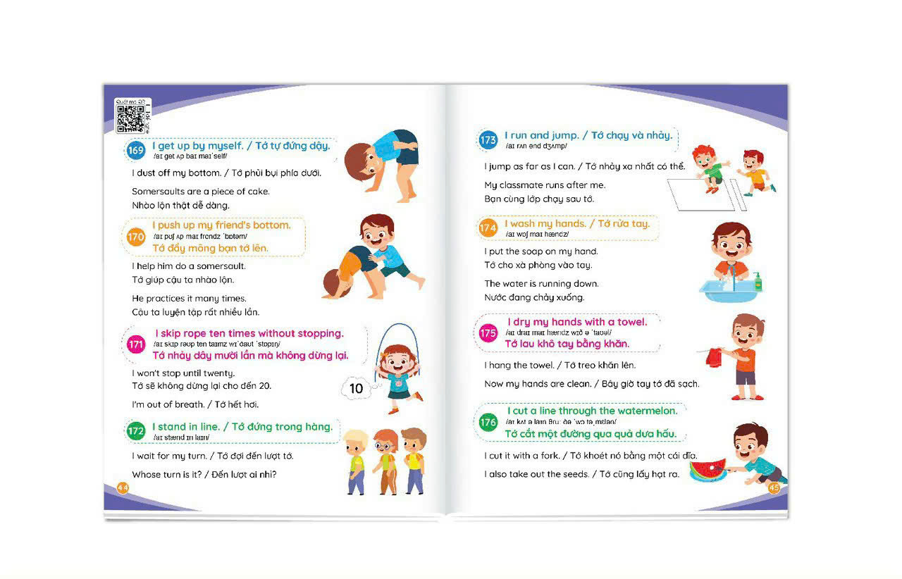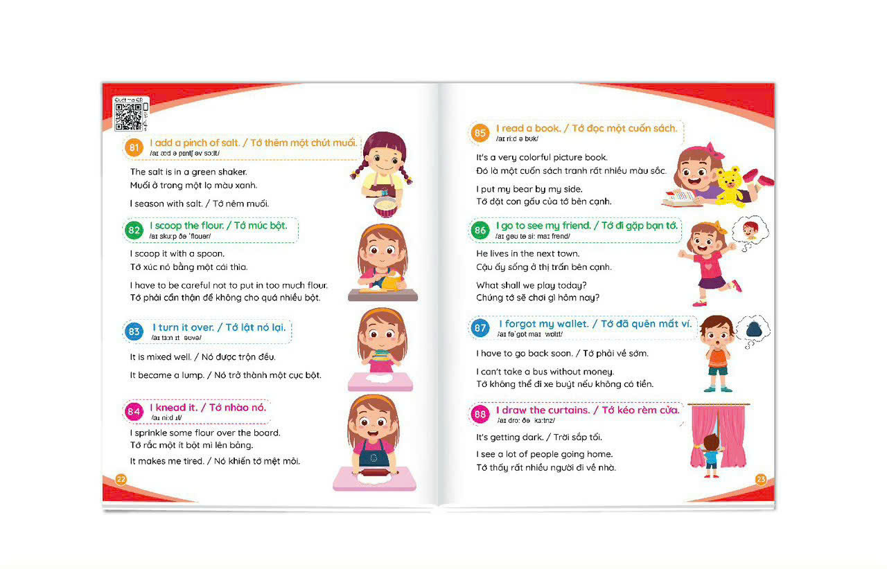 Mua tại TiktokSách 900 Câu Tiếng Anh Giao Tiếp Thường Dùng Hàng Ngày - Cẩm Nang Cho Mẹ Cùng Con Học Tiếng Anh Mỗi Ngày (Kèm File Nghe - Quét QR) GIỚI THIỆU SẢN PHẨM: Cuốn sách gồm 900 câu đàm thoại tiếng Anh để cha mẹ cùng con có thể giao tiếp về các chủ đề xung quanh cuộc sống hằng ngày, từ lúc thức dậy vào buổi sáng, đi học, đi chơi, đi siêu thị … cho đến lúc đi ngủ. Có cuốn sách này thì cha mẹ không lo bí từ, không biết nói tiếng Anh như thế nào cùng con. Đây là cuốn cẩm nang giúp cho cha mẹ có cơ hội học tập và giao tiếp tiếng Anh cùng con, để cả hai cùng tiến bộ mỗi ngày. Sách có kèm file nghe quét mã QR với giọng đọc tiếng Anh chuẩn để cha mẹ và con cùng nghe và tắm ngôn ngữ mỗi ngày. HƯỚNG DẪN BẢO QUẢN SÁCH THIẾU NHI: