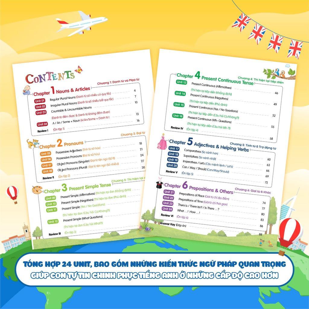 Nội dung cuốn sách tổng hợp bài tập bổ trợ cho 6 chương với 24 Unit trong cuốn ngữ pháp, giúp con củng cố, học sâu nhớ lâu kiến thức.