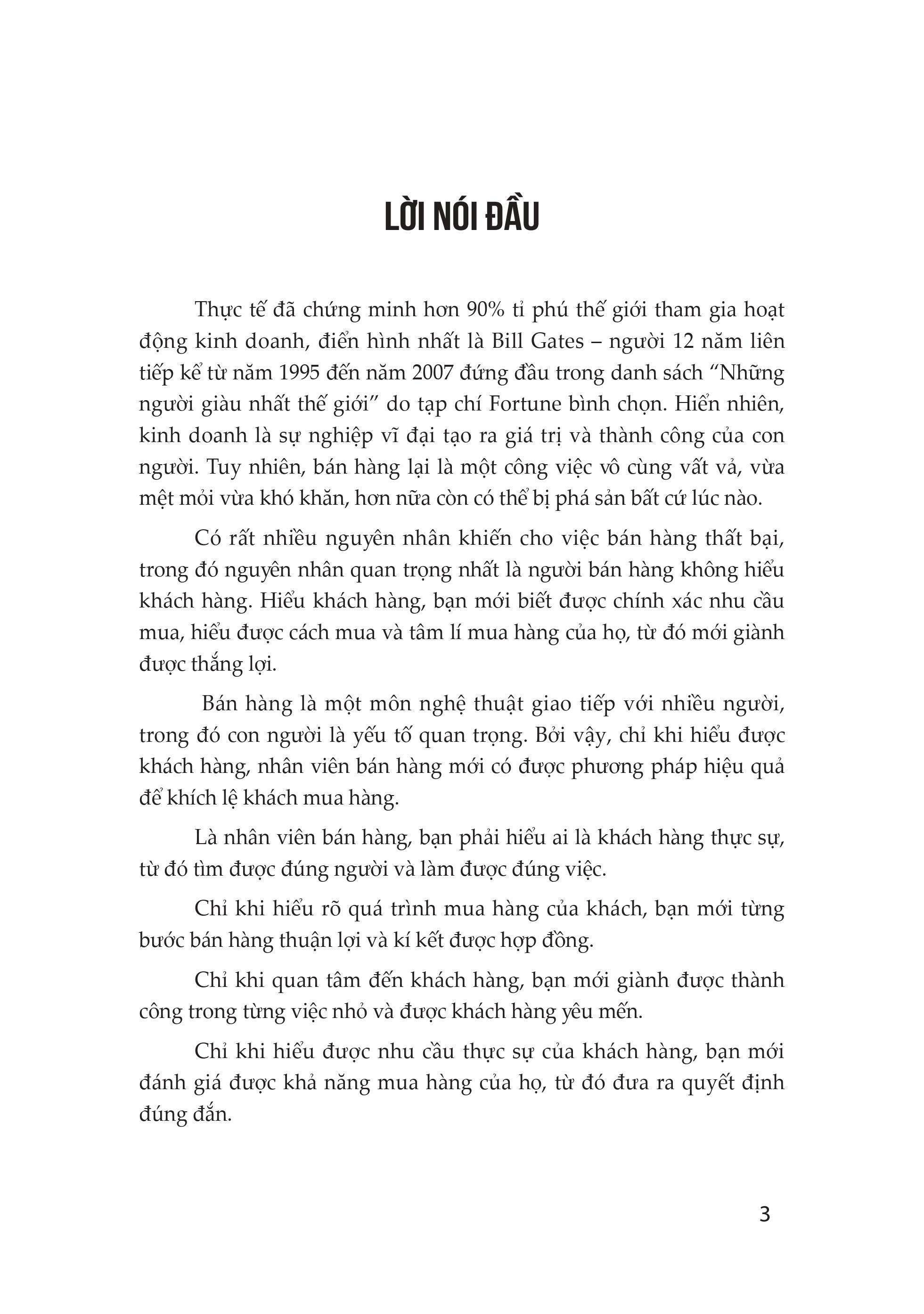 Một số nhân viên bán hàng luôn giới thiệu không biết mệt mỏi cho khách hàng nghe công ty của họ đáng tin cậy như thế nào, sản phẩm của họ chất lượng ra sao, và nếu hợp tác làm ăn với họ thì khách hàng sẽ nhận được những lợi ích vô cùng to lớn… nhưng kết quả bán hàng lại không tốt. Tại sao vậy? Vì những điều họ mang đến không phải là thứ khách hàng muốn, có nghĩa là họ không hiểu khách hàng. Nhân viên bán hàng cần thấu hiểu khách hàng, vì khách hàng đóng vai trò quan trọng nhất trong quá trình tiêu thụ. Không hiểu khách hàng, khách hàng sẽ không có hứng thú mua hàng; không hiểu khách hàng, khách hàng sẽ không mở ví lấy tiền mua hàng; không hiểu khách hàng, đương nhiên sẽ không bán được hàng.