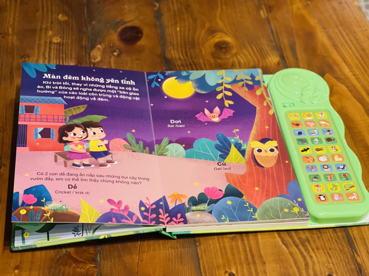 Nhắc đến sách Âm Thanh là nghĩ ngay đến bộ sưu tập những cuốn sách vừa rực rỡ vừa vui nhộn. Các sách đã phát hành với 05 nút âm thanh đã khiến bao em bé mê mẩn, Đinh Tị Books chính thức ra mắt một phiên bản siêu đặc biệt, dành riêng cho các bé: SÁCH ÂM THANH 30 NÚT DO CHÍNH NGƯỜI VIỆT BIÊN SOẠN, LẦN ĐẦU TIÊN XUẤT HIỆN TẠI VIỆT NAM, chắc chắn sẽ rất “Thu Hút Các Bé – Bố Mẹ Cùng Vui”. Cùng khám phá những ĐIỂM NỔI BẬT của cuốn sách chứa đựng rất nhiều tâm huyết và yêu thương của chúng mình nhé! Cuốn sách lấy chủ đề “Thế giới động vật” mang đến cho bé một không gian rộng lớn để làm quen với đa dạng các loài động vật: từ các bạn động vật gần gũi xung quanh mình, đến các bạn động vật dưới những tán cây trong rừng, trên những ngọn cây cao, động vật trong đêm tối, động vật ở địa cực lạnh giá Cuốn sách là chuyến phiêu lưu của hai bạn nhỏ là Bi và Bông. Trong hành trình tìm hiểu về động vật, hai bạn nhỏ được đi chơi trong rừng, được bố mẹ cho về thăm ông bà… tạo ra mạch truyện súc tích, gần gũi với đa số các bạn nhỏ, giúp các bạn nhỏ dễ đọc, dễ ghi nhớ nội dung, và nhiều bạn nhỏ còn có sự liên tưởng gần gũi đến những chuyến đi chơi, về thăm quê của chính mình. Phiên bản đặc biệt với 30 nút âm thanh, phù hợp cho bé 0-6 tuổi, giúp bé thỏa thích trải nghiệm mà không bị “ngợp” vì quá nhiều nút bấm. Đặc biệt, sách bổ sung các từ vựng tiếng Anh kèm theo phiên âm, giúp bé làm quen và rèn luyện tiếng Anh vừa vui vừa hiệu quả. Sách Âm Thanh “Thế Giới Động Vật” mở ra thế giới mới phong phú cho bé khám phá, nhận biết và phát triển trí tưởng tượng; Kích thích phát triển thính giác và thị giác – là mối liên kết quan trọng giúp phát triển ngôn ngữ cho trẻ nhỏ. Cuốn sách có rất nhiều cách đọc khác nhau, có thể đọc xuôi, có thể đố vui, có thể kéo bạn bè gia đình ngồi lại cùng tương tác. Chính sự kết hợp của rất nhiều giác quan và trạng thái cảm xúc khi sử dụng khiến sách Âm Thanh 30 nút đủ sức hút để kéo bé rời khỏi màn hình điện thoại đấy ba mẹ ạ.