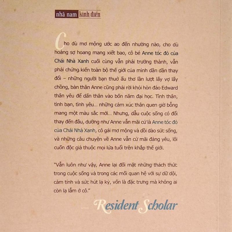 Tình thân, tình bạn, tình yêu… những cảm xúc thân quen giờ bỗng mang một màu sắc mới… Nhưng, cho dù cuộc sống có đổi thay đến đâu, dường như Anne vẫn mãi cứ là Anne tóc đỏ của Chái Nhà Xanh, cô gái mơ mộng và dồi dào sức sống, và những câu chuyện về Anne vẫn cứ mãi đáng yêu, lôi cuốn độc giả thuộc mọi lứa tuổi trên khắp thế giới.