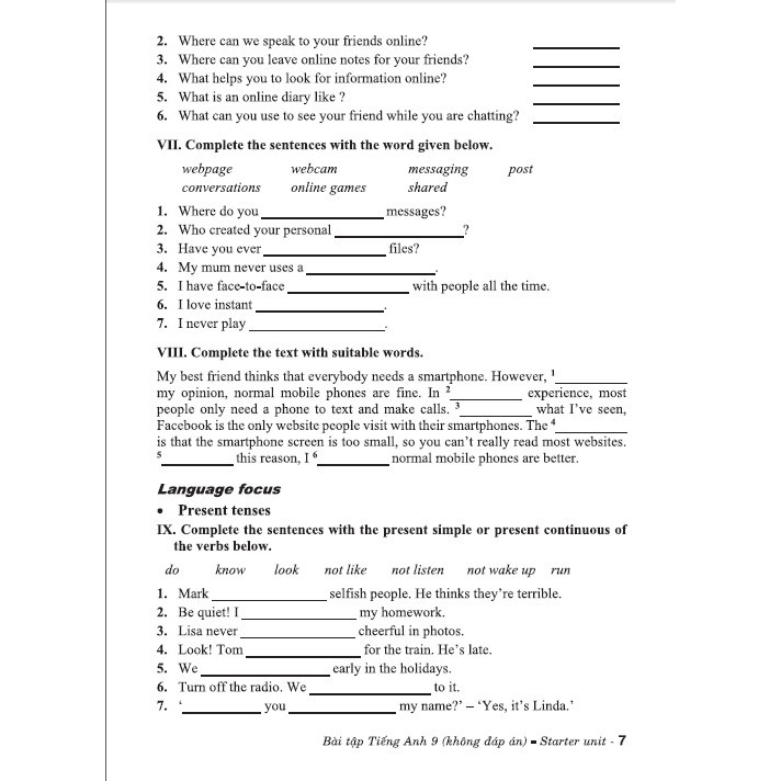Language focus, Reading, Pronunciation, Speaking, và Writing. Các bài Review (Vocabulary, Language focus, Reading, Speaking và Writing) giúp học sinh tự kiểm tra những nội dung kiến thức và rèn luyện các kĩ năng sau mỗi đơn vị bài học. Các bài tập trong Bài tập Tiếng Anh 9 – Không đáp án đa dạng, phong phú, bám sát từ vựng, ngữ pháp và chủ đề trong sách giáo khoa tiếng Anh theo chương trình mới.