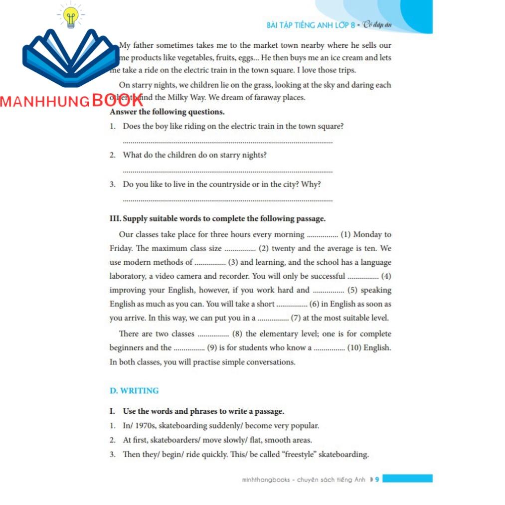 Sách Bài tập Tiếng Anh lớp 8 được biên soạn dựa trên thực tiễn của việc dạy và học tiếng Anh. Đây là nguồn tài liệu tham khảo bổ ích cho giáo viên và học sinh và rất thiết thực trong giao lưu quốc tế nhằm nâng cao khả năng sử dụng ngôn ngữ tiếng Anh trong thời kỳ hội nhập.