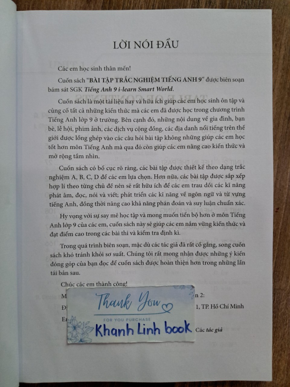Cuốn sách Bài Tập Trắc Nghiệm Tiếng Anh 9 - Có Đáp Án (Bám Sát SGK Cánh Diều) được biên soạn dựa trên sách Tiếng Anh 9 i-learn Smart World thuộc bộ sách giáo khoa Cánh Diều.