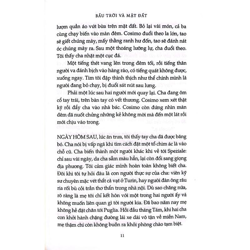 Bầu trời và Mặt đất là nhiều câu chuyện khác nhau: một tình yêu đắm đuối giữa hai nhân vật chính, mối ràng buộc giữa những người anh em, một cuộc truy tầm ý nghĩa tối hậu của đời sống. Chúng được đan cài với nhau một cách khéo léo thành cuộc đời của một con người duy nhất, một nhân cách độc đáo phi thường đủ khả năng cuốn phăng người đọc vào thế giới riêng của nó cho đến trang cuối cùng.