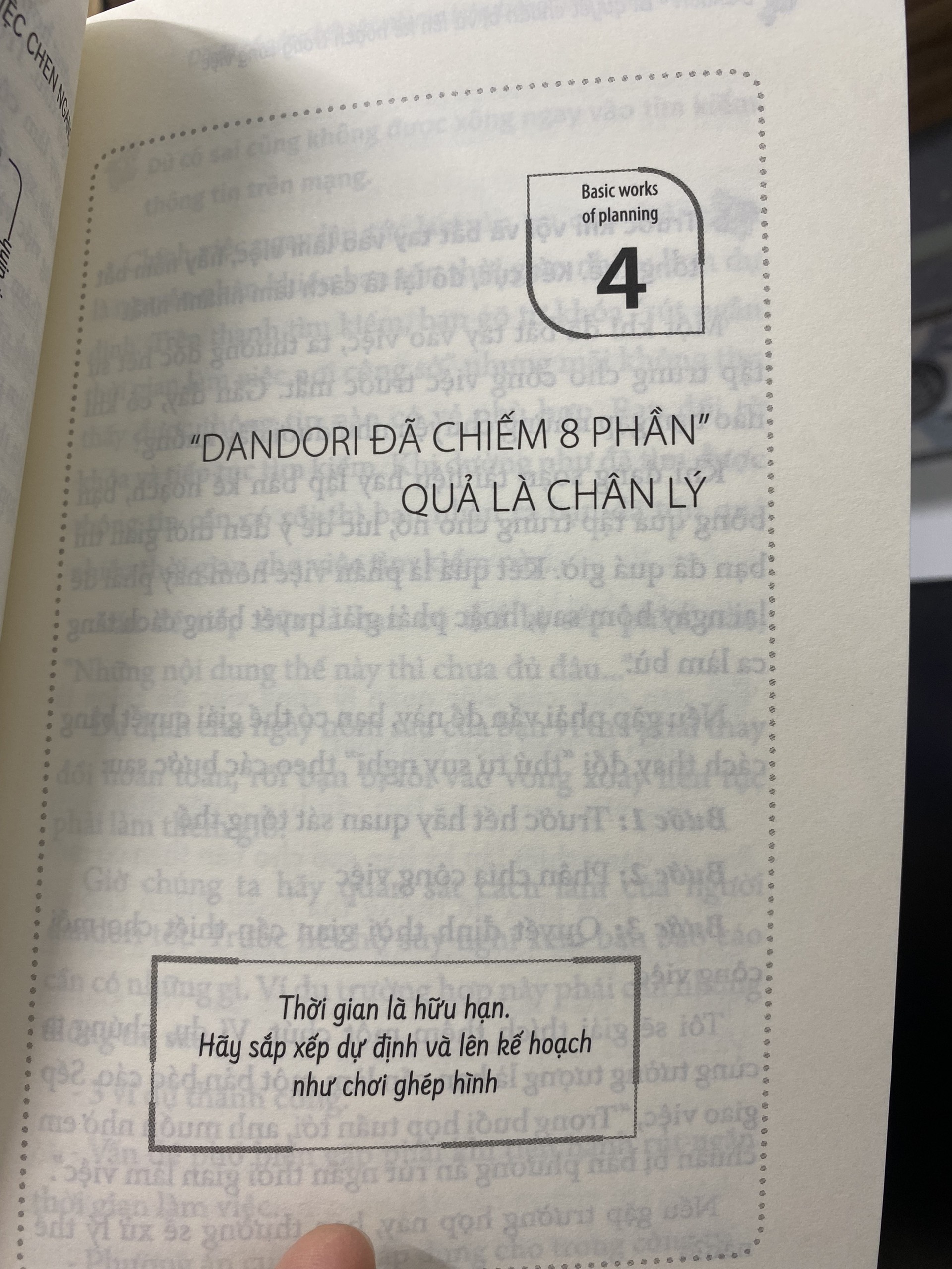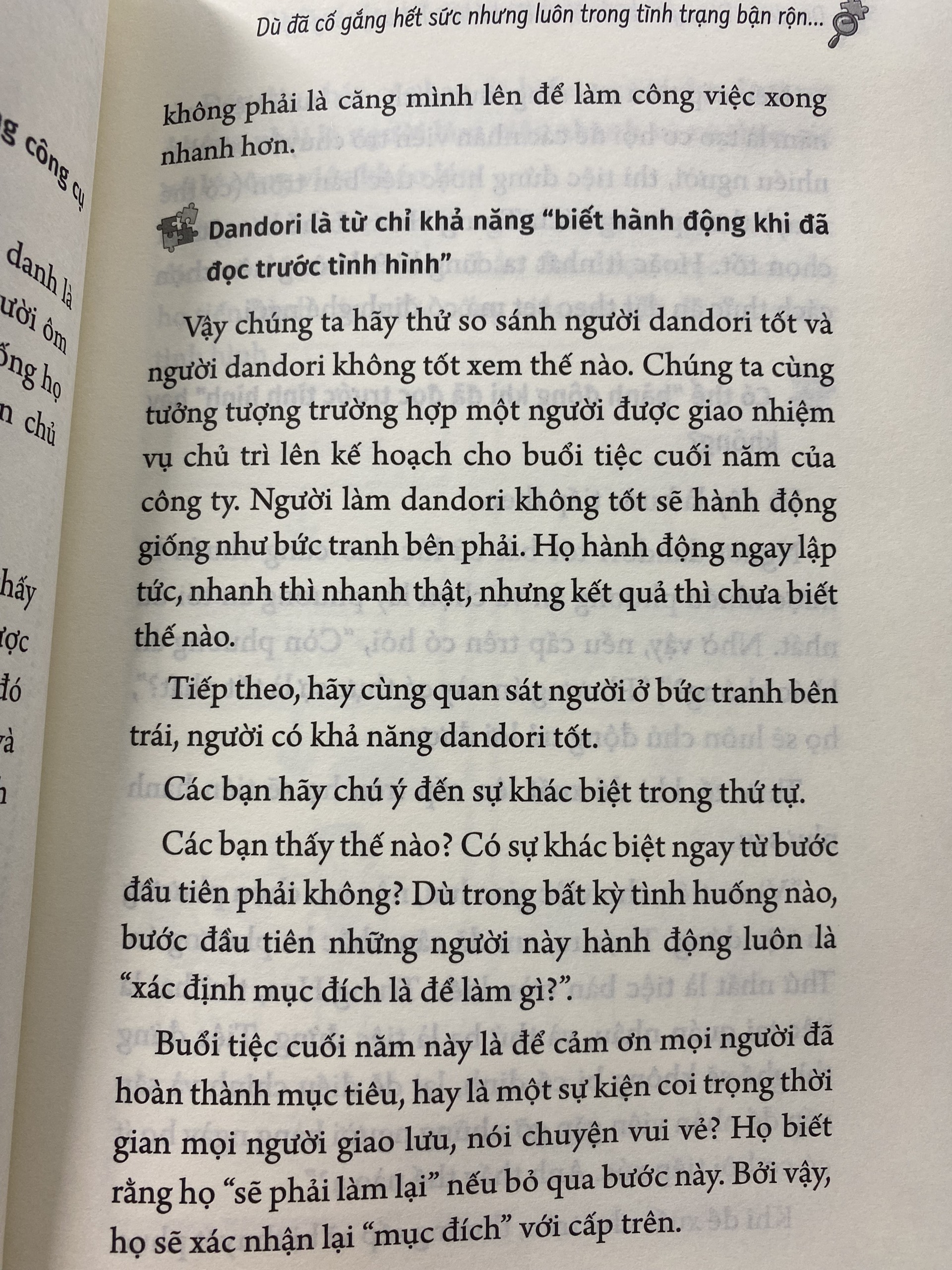 Ở Nhật, Dandori đã trở thành một từ phổ biến, người ta thường nghe “người này Dandori tốt” “người kia Dandori kém”. Vậy Dandori là gì? Có thể hiểu Dandori là năng lực chuẩn bị và sắp xếp công việc. Người có khả năng Dandori tốt không phải là người xử lý công việc nhanh, có thao tác khéo léo mà là người biết mục đích thực sự của việc mình sẽ làm và để đạt được mục đích đó phải lập kế hoạch chi tiết cũng theo nhiều phương án cụ thể, để dù có xảy ra bất cứ tình huống nào mục tiêu vẫn được thực hiện.