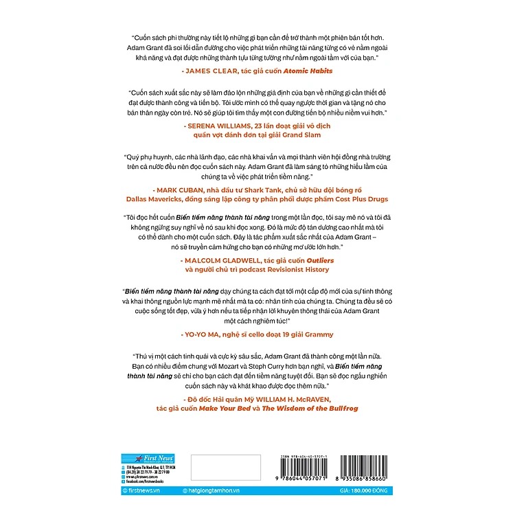 Thông qua những lập luận sắc bén và các ví dụ vừa thực tiễn vừa thú vị, Adam Grant giúp người đọc nhận ra rằng “thành công không chỉ là đạt được mục tiêu mà còn là sống theo các giá trị chúng ta coi trọng. Không có giá trị nào cao cả hơn việc khao khát trở thành một người tốt hơn so với phiên bản của ta ở hiện tại. Không có thành tựu nào vĩ đại hơn việc giải phóng tiềm năng còn đang ẩn giấu trong ta”. Vì lẽ đó, “Biến tiềm năng thành tài năng” không chỉ là một tác phẩm giàu cảm hứng mà còn mang đến một cái nhìn toàn diện về cách chúng ta có thể khai phá tiềm năng của bản thân và những người xung quanh.