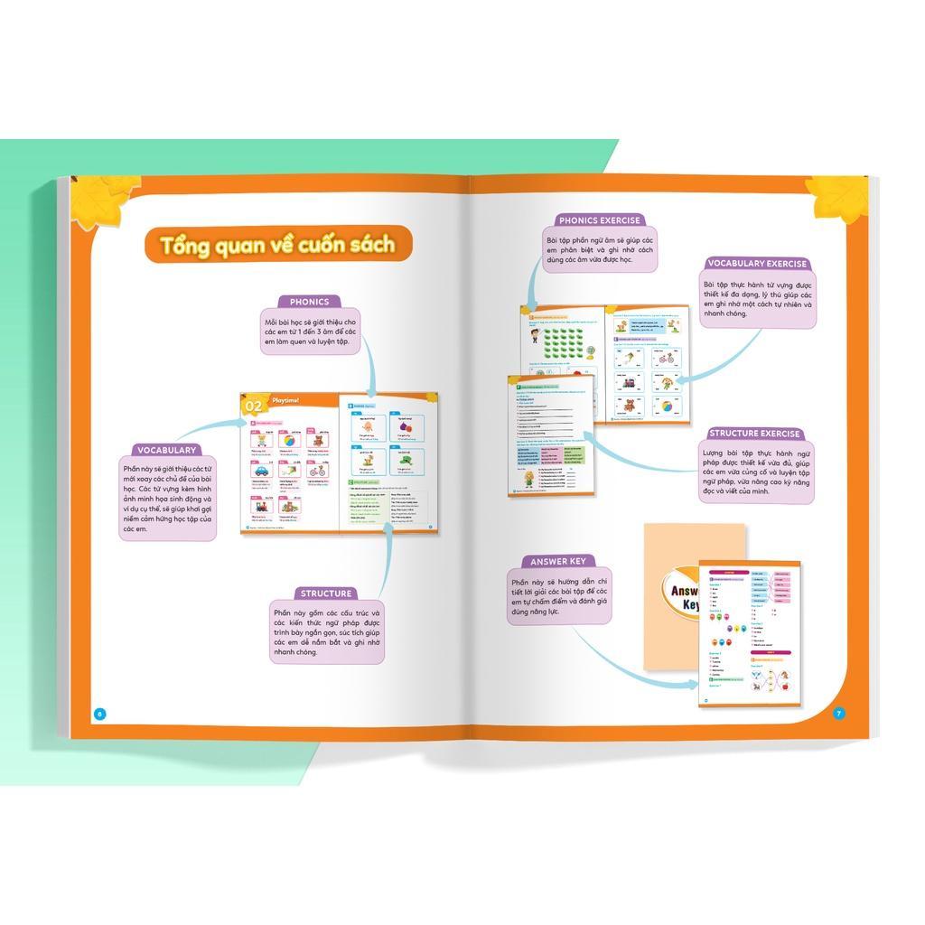 Mỗi cuốn gồm 9 đến 12 chủ đề thân thuộc với các em. Lồng ghép trong mỗi chủ đề chính là các kiến thức và bài tập tiếng Anh, mỗi bài học gồm các phần:
