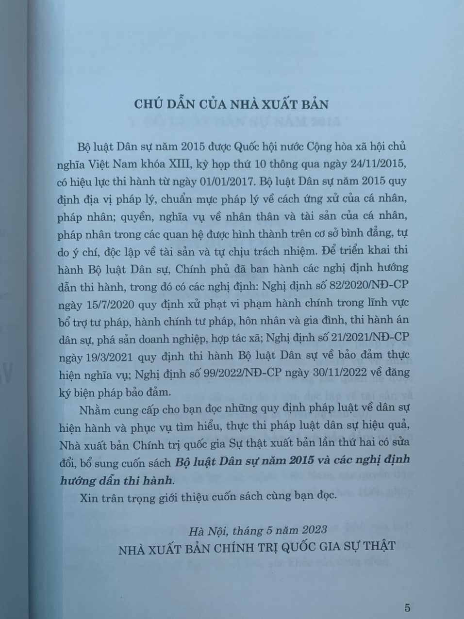 Nhằm cung cấp cho bạn đọc những quy định pháp luật về dân sự hiện hành và phục vụ tìm hiểu, thực thi pháp luật dân sự hiệu quả, Nhà xuất bản Chính trị quốc gia Sự thật xuất bản cuốn sách Bộ luật Dân sự năm 2015 và các nghị định hướng dẫn thi hành.