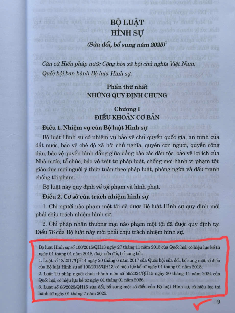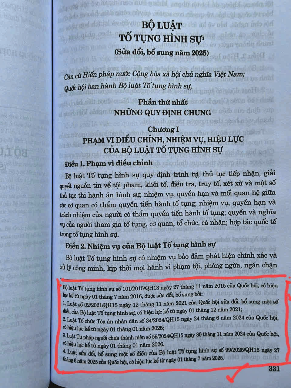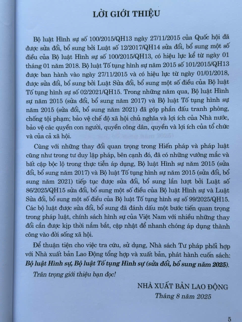 - Luật số 86/2025/QH15 sửa đổi, bổ sung một số điều của Bộ luật Hình sự, có hiệu lực thi hành từ ngày 01 tháng 7 năm 2025. Phần BỘ LUẬT TỐ TỤNG HÌNH SỰ trong cuốn sách này đã hợp nhất các Luật sửa đổi nên tiện tra cứu và áp dụng ạ: