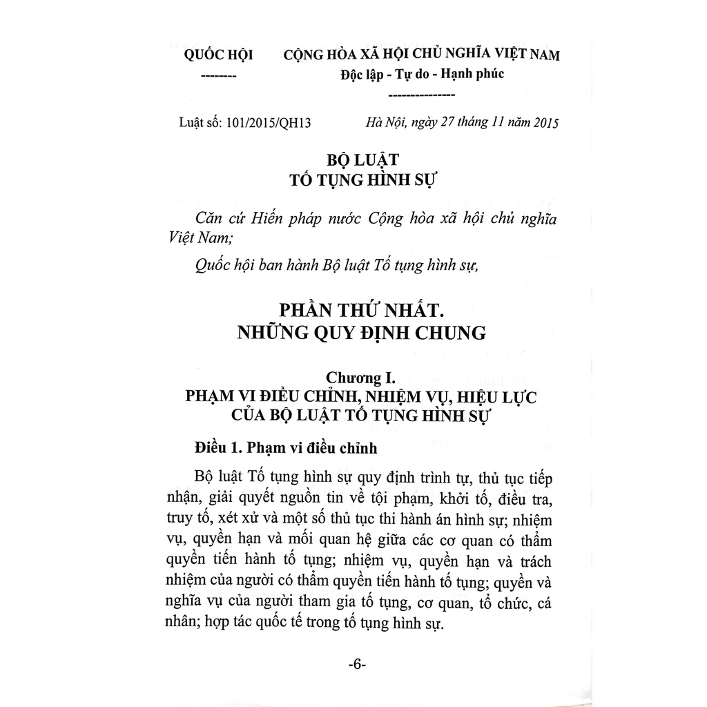 LỜI GIỚI THIỆU Bộ luật Tố tụng hình sự số 101/2015/QH13 ngày 27 tháng 11 năm 2015 của Quốc hội, có hiệu lực kể từ ngày 01 tháng 7 năm 2016, được sửa đổi,