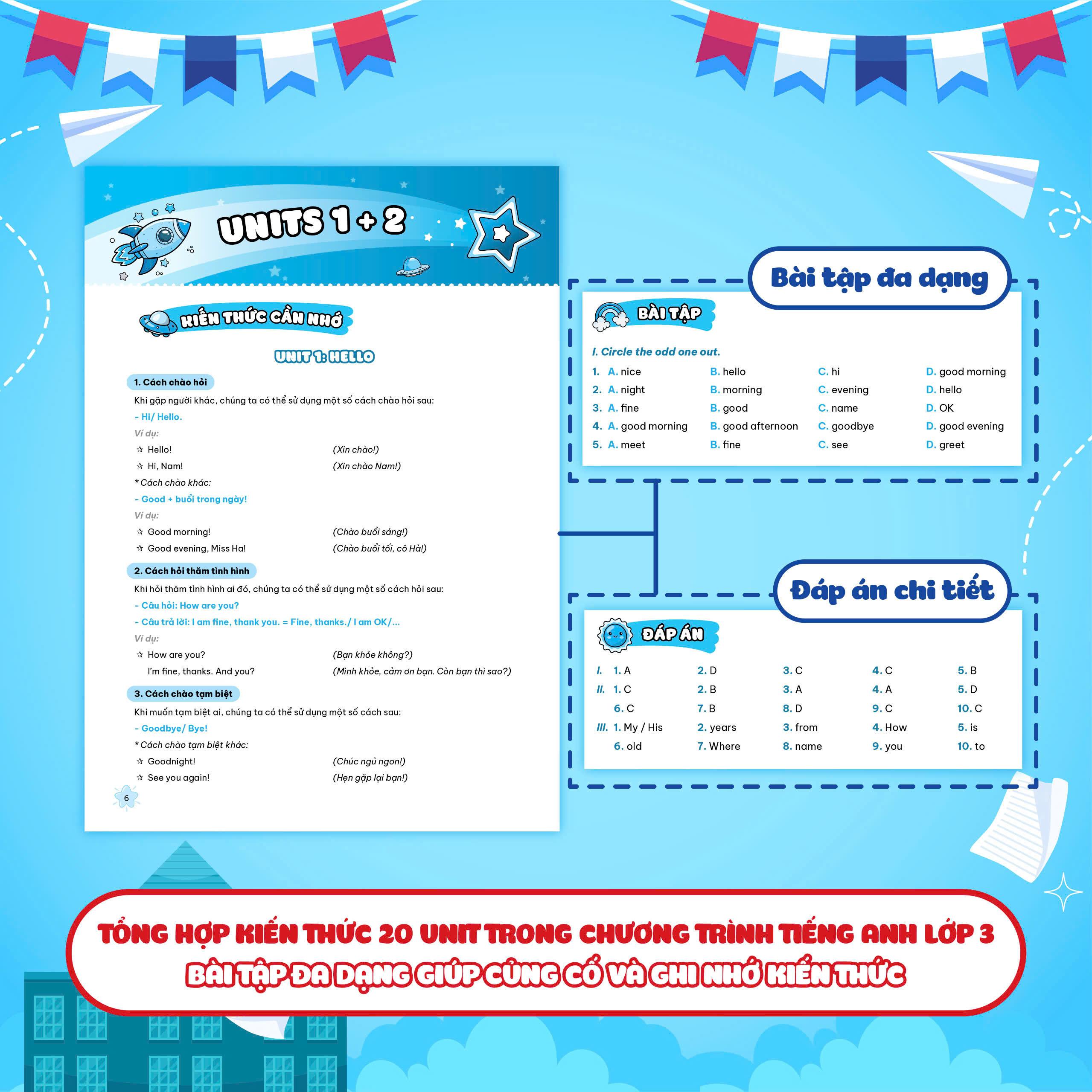 - Tổng hợp và mở rộng toàn bộ kiến thức với 20 Unit của chương trình học tiếng Anh lớp 3 theo Bộ Giáo dục & Đào tạo. Dưới mỗi phần lý thuyết là các bài tập vận dụng kèm lời giải, giúp các em dễ dàng ghi nhớ kiến thức vừa học và biết cách vận dụng cụ thể.