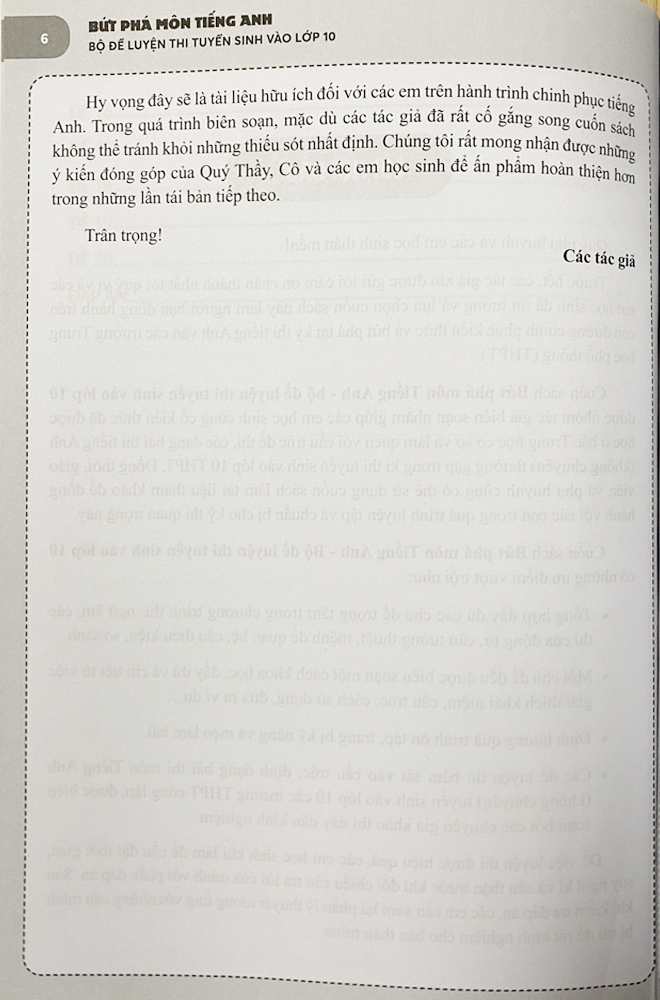 Cuốn sách "Bứt phá môn tiếng anh - Bồ đề luyện thi tuyển sinh vào lớp 10" được nhóm tác giả biên soạn nhằm giúp các em học sinh củng cố kiến thức đã được học ở bậc Trung học cơ sở và làm quen với cấu trúc đề thi, các dạng bài thi tiếng Anh (không chuyên) thường gặp trong kì thi tuyển sinh vào lớp 10 PTTH.