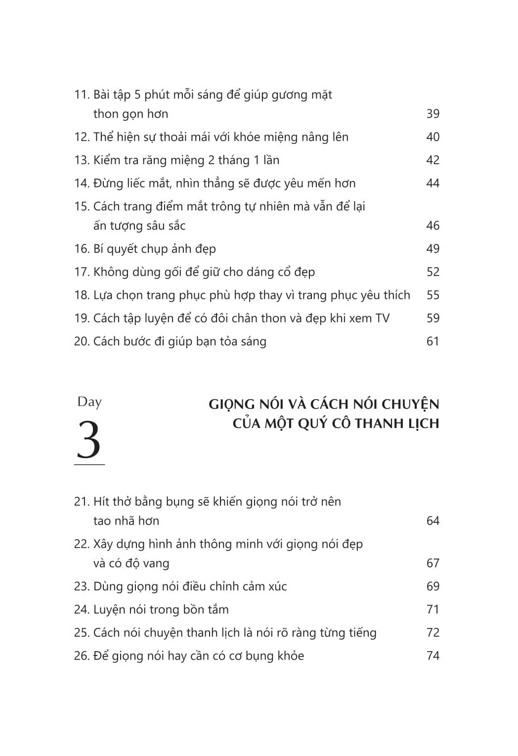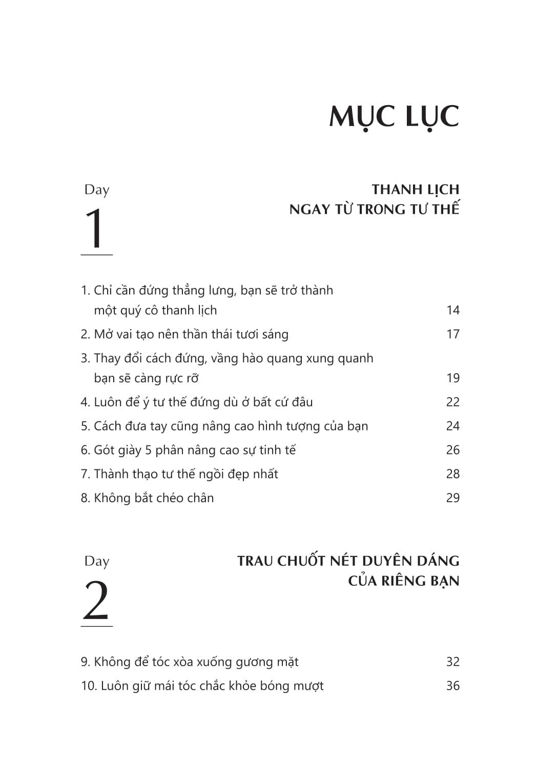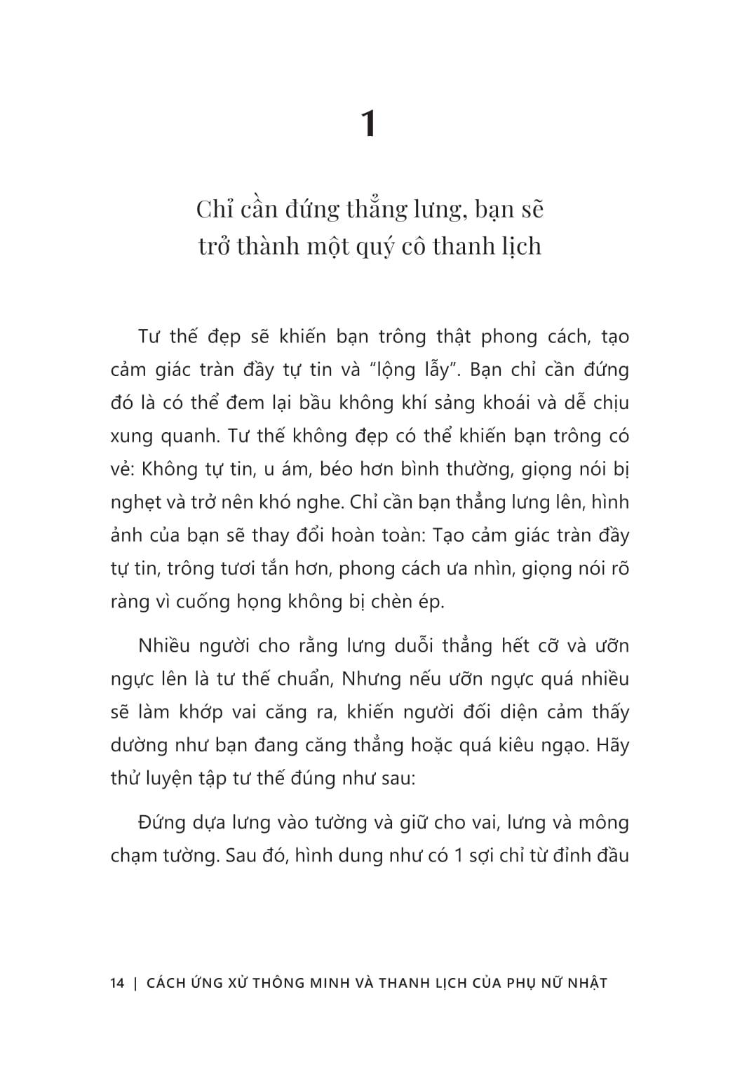 Ấn tượng đầu tiên quyết định cơ hội của chúng ta, vì con người có xu hướng mặc định ấn tượng về đối phương chỉ qua vài giây gặp gỡ ngắn ngủi. Để thể hiện sức hút riêng của m.ình và nhanh chóng gây dựng cảm tình từ người khác ngay từ lần gặp đầu tiên, chỉ vẻ ngoài chỉn chu là chưa đủ. Thứ bạn cần là một “chiến lược ứng xử bài bản” từ Cách ứng xử thông minh và thanh lịch của phụ nữ Nhật. Phong thái thanh lịch, tinh tế và sang trọng của những người phụ nữ Nhật chuẩn mực hẳn là một dấu ấn mà ai từng tiếp xúc không thể quên. Họ không chỉ biết kiểm soát cơ mặt, dáng đi mà còn biết sử dụng ngôn ngữ giao tiếp một cách khéo léo. Mọi bí quyết sẽ được chuyên gia Mika chắt lọc và chia sẻ thông qua các bài tập hướng dẫn thực hành trong 7 ngày theo từng chủ đề: tư thế, ngoại hình, giọng điệu, cách trò chuyện, cách ứng xử, phụ kiện mang theo,... hứa hẹn là “trợ thủ đắc lực” giúp bạn thể hiện trọn vẹn nét thanh lịch một cách tự nhiên nhất.