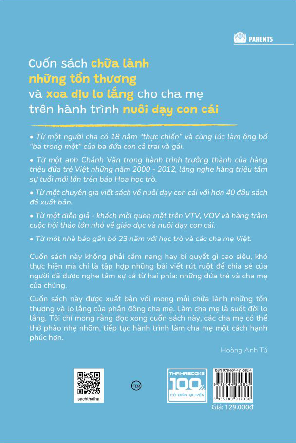 Tên sách          Cha mẹ khờ - Ôn luyện con khôn  Tác giả Hoàng Anh Tú Nhà xuất bản   Công Thương  Giá bìa 129.000đ Số trang           264 trang Khổ giấy         14 x 20.5 cm Barcode - ISBN          8935280917330 – 9786044815824   CHA MẸ KHỜ - ÔN LUYỆN CON KHÔN  Hoàng Anh Tú  Xin lỗi con vì những điều cha mẹ MUỐN TỐT cho con mà đã vô tình khiến con bị tổn thương trong suốt những năm tháng ấu thơ của mình. Xin lỗi con vì cha mẹ đã quên mình từng là trẻ con, vì đã không nhận ra con chưa từng làm cha mẹ. Xin lỗi con vì những bận rộn mưu sinh khiến cha mẹ chưa lắng nghe hết lời con muốn nói. Xin lỗi con vì cả những vụng về của lần đầu làm cha, làm mẹ. Cảm ơn con vì đã làm con, trở thành cội nguồn hạnh phúc của cha mẹ. Cảm ơn con vì đã bao dung, tha thứ cho cha mẹ. Cảm ơn con vì tất cả, vì chúng ta đã có mặt cùng nhau, cùng đi trên hành trình này. Cuốn sách này không được viết từ người cha hoàn hảo, trái lại nó được viết từ một người cha yêu con một cách vụng về, đầy lỗi và cũng chưa từng muốn trở thành người cha hoàn hảo. Cuốn sách dành cho những người cha, người mẹ như tôi, trong hành trình Cha mẹ khờ - Ôn luyện con khôn. - Tác giả Hoàng Anh Tú  Làm cha mẹ là một hành trình đầy cảm xúc, không chỉ có niềm vui mà còn cả những nỗi buồn. Có những khi chúng ta cảm thấy tổn thương không phải vì con mắc lỗi, mà chính vì lo lắng mình chưa làm tròn trách nhiệm.  Con đang không ổn bố mẹ ạ! Giá như mọi đứa trẻ đều có thể nói ra những suy nghĩ và cảm xúc với cha mẹ của mình. Một đứa trẻ nói ra được tâm trạng của mình với cha mẹ là một đứa trẻ can đảm. Và quan trọng hơn, cha mẹ của đứa trẻ đó cũng là những người làm cha mẹ đáng học hỏi. Chỉ tiếc rằng, phần lớn những đứa trẻ này không thể nói ra được là bởi cha mẹ chúng chưa bao giờ để chúng được nói ra, mà chỉ thường xuyên quát mắng: “Trẻ con thì biết cái gì?” Bằng việc quy kết, phán xét, mắng mỏ, phủ nhận hoặc phớt lờ chúng từ rất lâu trước đó, cha mẹ khiến chúng nghĩ rằng: “Nói ra với cha mẹ cũng chẳng có nghĩa gì, đằng nào cha mẹ cũng có nghe đâu”. Chúng ta chỉ có năm giác quan: Thính Giác - Thị giác - Khứu giác - Vị giác - Xúc giác. Những khi làm cha mẹ, chúng ta có thêm hai giác quan nữa là Trực giác và Tự giác. Cha mẹ khờ - ôn luyện con khôn” sẽ là người bạn đồng hành cùng bạn học cách sử dụng trọn vẹn 7 giác quan đó trong hành trình nuôi dạy con và xây dựng gia đình hạnh phúc. Cuốn sách này không phải cẩm nang hay bí quyết gì cao siêu, khó thực hiện mà là chia sẻ những bí quyết, kinh nghiệm để cha mẹ thấu hiểu con hơn, từ đó có cách giáo dục phù hợp. Cuốn sách với mong mỏi chữa lành những tổn thương và lo lắng của phần đông cha mẹ. Làm cha mẹ là suốt đời lo lắng. Chúng ta không cần làm cha mẹ hoàn hảo mới dạy được con mình.  Mong rằng cuốn sách này sẽ giúp các cha mẹ có thể thở phào nhẹ nhõm, tiếp tục hành trình làm cha mẹ một cách hạnh phúc hơn. Cuốn sách được biết bởi – Tác giả Hoàng Anh Tú - Một người cha có 18 năm “thực chiến” và cùng lúc làm ba ông bố trong một ông bố với ba đứa con của mình. - Một anh Chánh Văn trong hành trình trưởng thành của hàng triệu đứa trẻ Việt những năm 2000 - 2012, lắng nghe hàng triệu tâm sự tuổi mới lớn trên báo Hoa Học Trò. - Một chuyên gia viết sách về nuôi dạy con cái với hơn 40 đầu sách đã xuất bản. - Một diễn giả - khách mời quen mặt trên VTV, VOV và hàng trăm cuộc hội thảo lớn nhỏ về giáo dục và nuôi dạy con cái. -