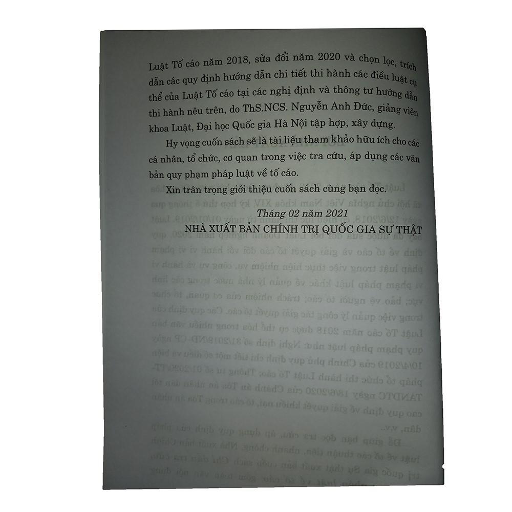 Nội dung sách giúp bạn đọc tra cứu, áp dụng quy định của pháp luật về tố cáo thuận tiện, nhanh chóng. Sách gồm toàn văn nội dung Luật Tố cáo năm 2018, sửa đổi năm 2020 và chọn lọc, trích dẫn các quy định hướng dẫn chi tiết thi hành các điều luật cụ thể của Luật Tố cáo tại các nghị định và thông tư hướng dẫn thi hành.
