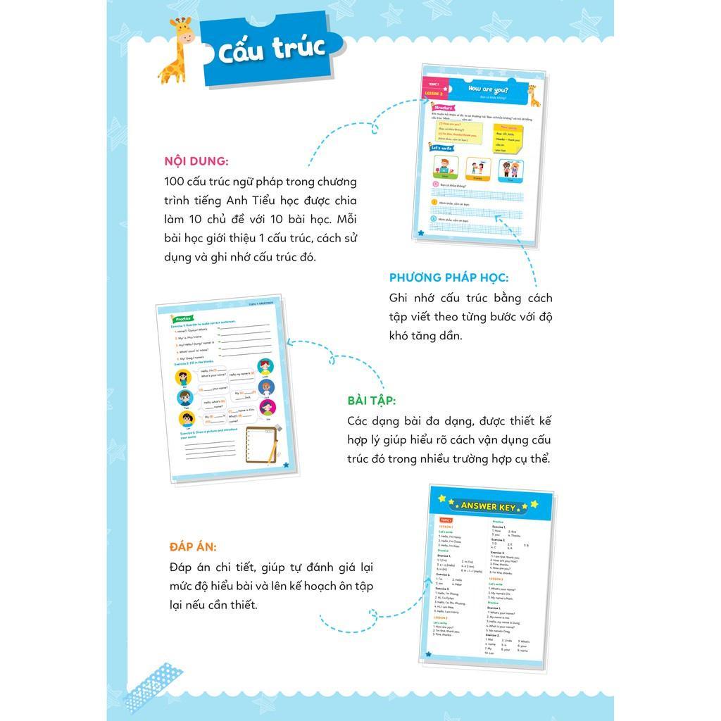 - Cuốn sách được thiết kế thân thiện với các em học sinh, các hình vẽ minh họa sinh động, thu hút Với những ưu điểm trên, Combo Chinh phục 100 cấu trúc Ngữ pháp tiếng Anh Tiểu học – Tập 1 & 2 chắc chắn sẽ là người bạn đồng hành giúp các em học sinh thích thú, học – hiểu và say mê tiếng Anh ngay từ nhỏ!