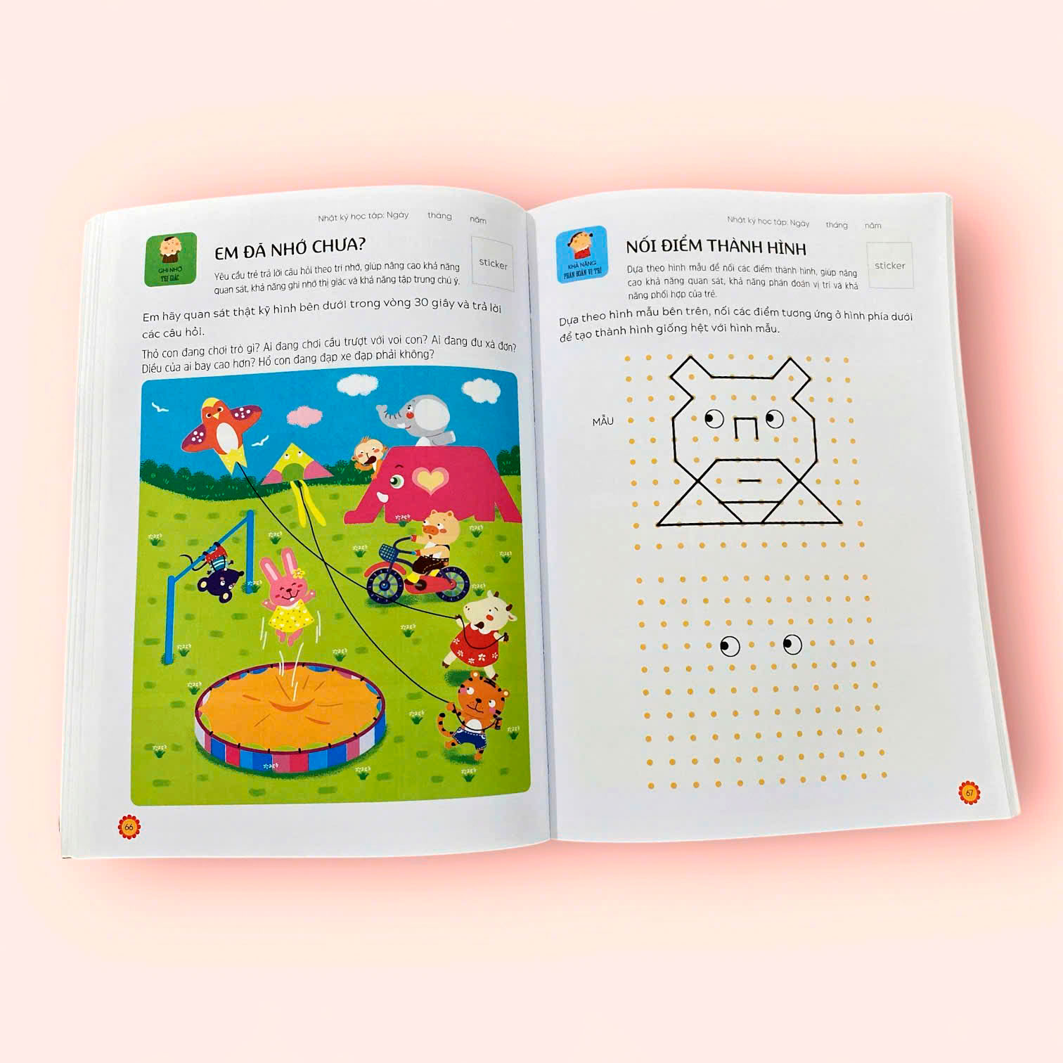 Đếm đồ vật, nối số, so sánh ít nhiều, phân loại, tìm điểm khác nhau, làm quen với khái niệm về thời gian, tìm điểm sai, tô màu, phân biệt màu sắc, sắp xếp theo thứ tự, hiểu khái niệm trái nghĩa….là những nội dung trò chơi có trong cuốn PHÁT TRIỂN TƯ DUY NÃO TRÁI.