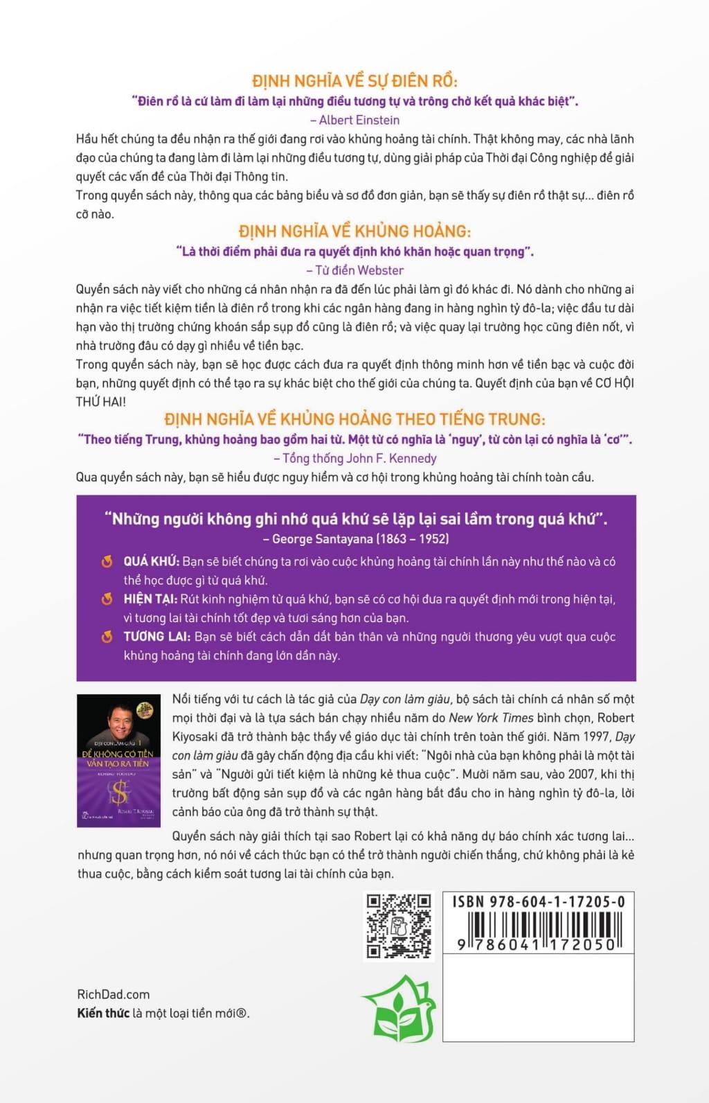 ĐỊNH NGHĨA VỀ SỰ ĐIÊN RỒ: “Điên rồ là cứ làm đi làm lại những điều tương tự và trông chờ kết quả khác biệt”. – Albert Einstein Hầu hết chúng ta đều nhận ra thế giới đang rơi vào khủng hoảng tài chính. Thật không may, các nhà lãnh đạo của chúng ta đang làm đi làm lại những điều tương tự, dùng giải pháp của Thời đại Công nghiệp để giải quyết các vấn đề của Thời đại Thông tin. Trong quyển sách này, thông qua các bảng biểu và sơ đồ đơn giản, bạn sẽ thấy sự điên rồ thật sự… điên rồ cỡ nào. ĐỊNH NGHĨA VỀ KHỦNG HOẢNG: “Là thời điểm phải đưa ra quyết định khó khăn hoặc quan trọng”. – Từ điển Webster Quyển sách này viết cho những cá nhân nhận ra đã đến lúc phải làm gì đó khác đi. Nó dành cho những ai nhận ra việc tiết kiệm tiền là điên rồ trong khi các ngân hàng đang in hàng nghìn tỷ đô-la; việc đầu tư dài hạn vào thị trường chứng khoán sắp sụp đổ cũng là điên rồ; và việc quay lại trường học cũng điên nốt, vì nhà trường đâu có dạy gì nhiều về tiền bạc. Trong quyển sách này, bạn sẽ học được cách đưa ra quyết định thông minh hơn về tiền bạc và cuộc đời bạn, những quyết định có thể tạo ra sự khác biệt cho thế giới của chúng ta. Quyết định của bạn về CƠ HỘI THỨ HAI! ĐỊNH NGHĨA VỀ KHỦNG HOẢNG THEO TIẾNG TRUNG: “Theo tiếng Trung, khủng hoảng bao gồm hai từ. Một từ có nghĩa là ‘nguy’, từ còn lại có nghĩa là 'cơ”. – Tổng thống John F. Kennedy Qua quyển sách này, bạn sẽ hiểu được nguy hiểm và cơ hội trong khủng hoảng tài chính toàn cầu. “Những người không ghi nhớ quá khứ sẽ lặp lại sai lầm trong quá khứ”. – George Santayana (1863 – 1952)