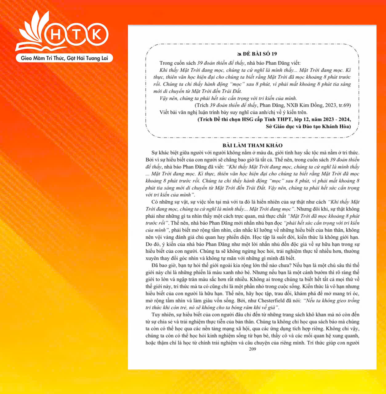Điểm đáng chú ý của cuốn sách này là tuyển chọn 20 đề thi và đáp án, biểu điểm tham khảo cùng nhiều đề bài luyện tập hay được sưu tầm và tuyển chọn. Để giúp các em có thêm nguồn tư liệu tham khảo thật phong phú, ngoài các đoạn văn, bài viết của học sinh đã được chỉnh sửa và hoàn thiện, tôi xin phép được trích dẫn một số tác phẩm của nhà văn, nhà thơ, các nhà phê bình; tham khảo các kiến thức Lí luận văn học và sử dụng một số đề thi và đáp án, biểu điểm chính thức của Sở Giáo dục và Đào tạo một số tỉnh thành, của Bộ Giáo dục và Đào tạo trong thời gian gần đây.