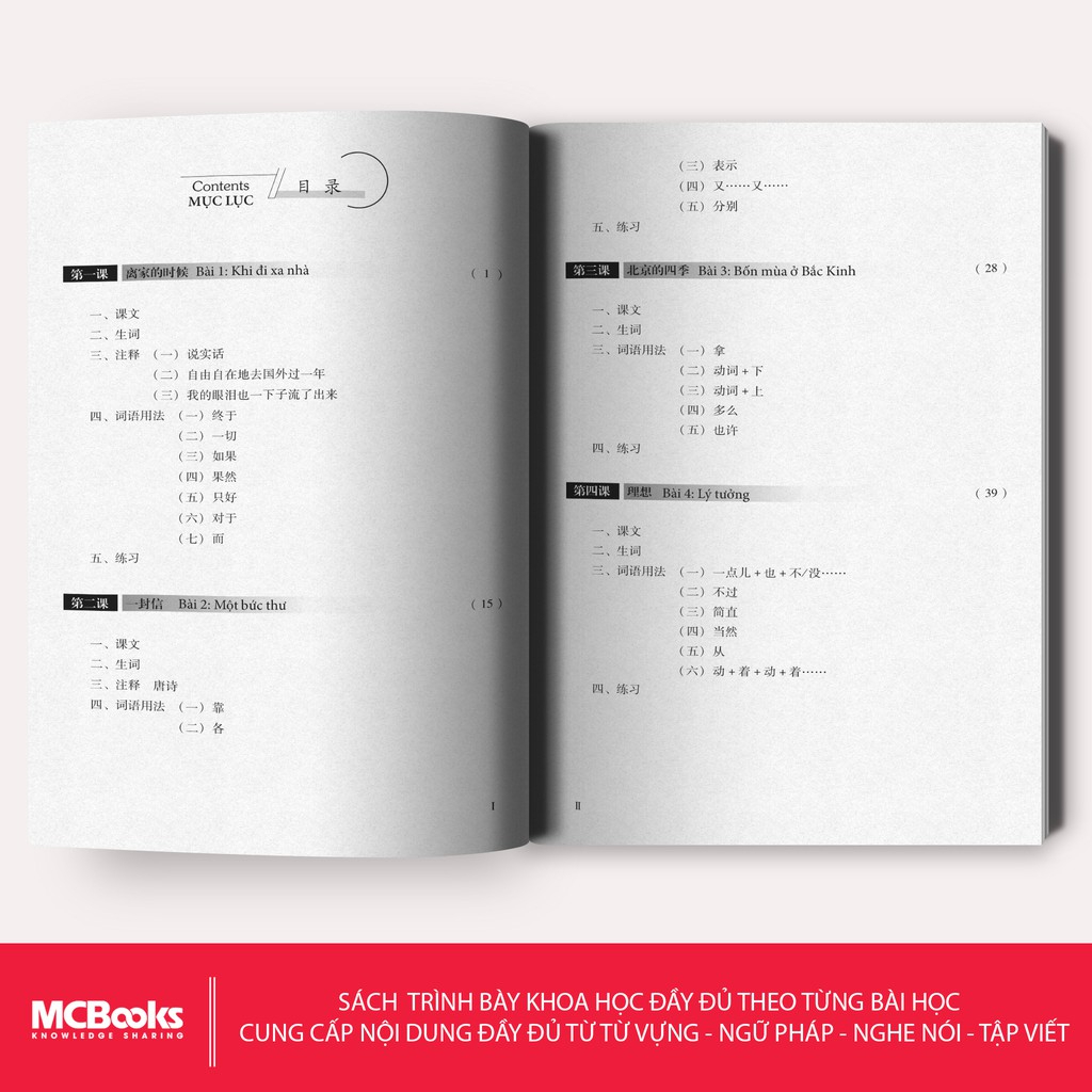 Các bài học trong “Giáo trình Hán ngữ 2 Tập 1 Quyển hạ phiên bản 3″ được Mcbooks thiết kế như sau: 1. Bài đọc, 2. Từ mới, 3. Chú thích, 4. Ngữ âm, Ngữ