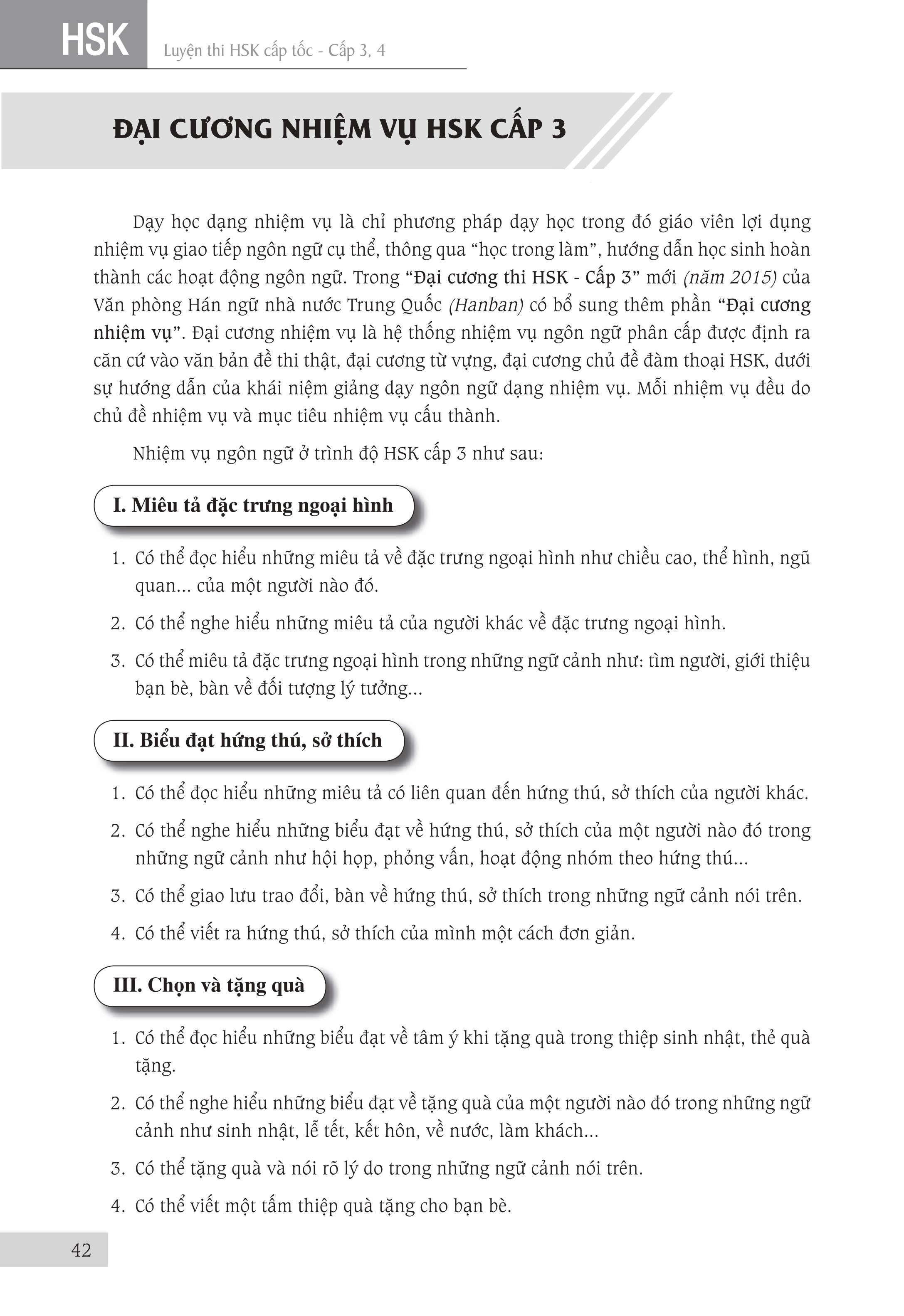 1. Luyện thi HSK cấp tốc cấp 3+4 Tác giả: Trương Văn GIới & Lê Khắc Kiều Lục Nhà xuất bản Đại Học Quốc Gia TPHCM Số trang: 424 Kích thước: 18.5cm x 26.5cm x 2cm Cân nặng: 570g Năm xuất bản: 2018 Đầu tiên xin được thuyết minh về chữ “cấp tốc” mà chúng tôi dùng trong tên của bộ sách. “Cấp tốc” không phải theo ý nghĩa đơn giản là nhanh và dễ dàng, không cần phải học nhiều mà cũng có thể thi đậu. Ý nghĩa của từ “Cấp tốc” mà chúng tôi hướng đến khi biên soạn bộ sách này là giúp người học nắm vững toàn bộ kiến thức của kỳ thi của một cách nhanh nhất mà vẫn bảo đảm kết quả tốt nhất. Người học vẫn phải làm việc cật lực để chuẩn bị tốt cho kỳ thi mới hy vọng có được kết quả khả quan. Kỳ thi HSK do Văn phòng Hán ngữ nhà nước Trung Quốc (gọi tắt là HANBAN) tổ chức. HANBAN đã xây dựng chuẩn kiến thức (từ vựng, điểm ngôn ngữ, chủ đề đàm thoại …) cho từng cấp độ, từ đó đưa ra đề thi mẫu tương ứng cho cấp độ thi đó. Như vậy, Đề cương và Đề thi mẫu của HANBAN chính là tài liệu chuẩn để thí sinh ôn luyện, giáo viên và các trường giảng dạy cho kỳ thi HSK. Nó cũng là đề cương để các tác giả, nhà xuất bản và các đơn vị biên soạn và xuất bản các tài liệu cho kỳ thi này. Để đạt mục tiêu “cấp tốc” đã giải thích ở trên, chúng tôi dựa vào Đề cương và Đề thi mẫu của HANBAN, cũng như những tài liệu luyện thi HSK của Trung Quốc để biên soạn bộ sách này. Từng phần của bài thi được giới thiệu qua một cấu trúc thống nhất như sau: I. Đặc điểm dạng đề: Phần này giới thiệu cấu trúc, đặc điểm và cách làm dạng bài thi này. Ở đề thi viết còn giới thiệu cách chấm điểm của dạng đề. Rõ ràng là để làm bài thi tốt, đầu tiên là phải nắm vững đề thi và biết cách làm loại đề thi đó. II. Những lỗi thường gặp: Chúng tôi tổng hợp những lỗi thường gặp của thí sinh khi làm dạng đề thi này. Học tập từ sai lầm là cách cực kỳ hiệu quả để tránh lặp lại những sai lầm của những người đi trước đã gặp phải khi làm bài. III. Trọng điểm thi, cách thức và kỹ xảo làm bài: Đây là phần quan trọng nhất của tài liệu Phần trọng điểm thi giới thiệu những trọng tâm mà dạng đề thi tập trung vào. Liên quan đến trọng điểm thi này, chúng tôi đã hệ thống hóa các điểm ngôn ngữ, công thức hóa các cấu trúc ngữ pháp cũng như tập hợp các từ ngữ có liên quan. Tiếp theo, người học sẽ được giới thiệu về cách thức, kỹ xảo làm bài. Cuối cùng là Mục phân tích ví dụ, Phần này được chúng tôi biên soạn hết sức công phu vì biết rằng những lý thuyết, những phân tích ở phần trọng điểm thi, cách thức kỹ xảo làm bài sẽ rất khó được nắm bắt nếu không có những ví dụ cụ thể. Những ví dụ được sử dụng được lấy từ các đề thi, ưu tiên lấy từ đề thi mẫu của HANBAN, để minh họa cho những vấn đề đã được giới thiệu ở phần trọng điểm thi và cách thức kỹ xảo làm bài.