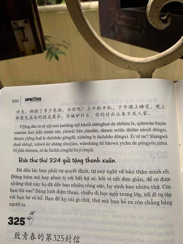 2. Giới thiệu sách: gửi tôi thời Thanh Xuân (bìa cứng, có Audio nghe) Tác giả: Nhật Phạm Xuất bản: 2021 Nhà xuất bản: Thanh niên Công ty phát hành: Tuệ Lâm Linh Số trang: 403 Giá bìa: 320000 VNĐ Nội dung sách:Gồm những bức thư song ngữ (Trung – Việt – Pinyin) gửi tặng thanh xuân tươi đẹp Khi bạn cầm trên tay cuốn sách này, tôi tin rằng, bạn sẽ nhanh chóng tìm thấy thứ mà lâu nay bạn vẫn đang tìm kiếm và theo đuổi ở sâu thẳm trong tâm trí, bởi đây là một quyển sách viết cho tâm hồn bạn. Trong cuốn sách này, chúng ta có thể tìm thấy một bản thân thành thực nhất, nghe được những lời khuyên có giá trị nhất, nhận được lời an ủi cảm động lòng người nhất.
