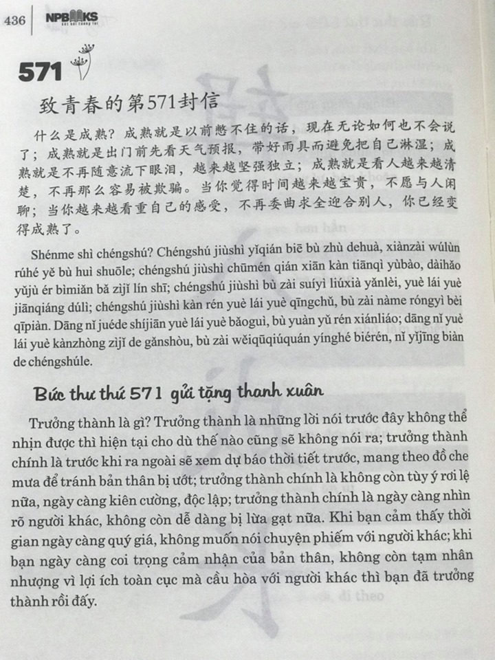 Vậy nên, đừng vội vàng gập sách lại, hãy nhẫn nại và đọc tiếp, trong không gian tràn ngập ánh nắng, yên lặng đọc sách, và tận hưởng. Thế giới không vì cảm xúc của chúng ta mà thay đổi, đôi lúc chúng ta đau buồn, đôi lúc chúng ta phiền muộn, những cảm giác đó dường như luôn quấn chặt lấy chúng ta. Thực ta tôi muốn nói với bạn rằng, những điều này đều là những phần không thể thiếu trong cuộc đời bạn, dù cho nó có không làm bạn vui vẻ, thì cũng mong rằng bạn có thể lau đi những giọt nước mắt nơi khoé mắt, từ giây phút này trở đi, hãy học cách hạnh phúc.